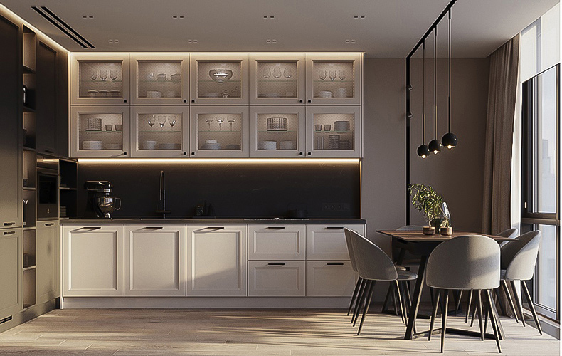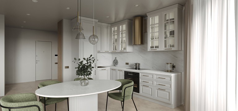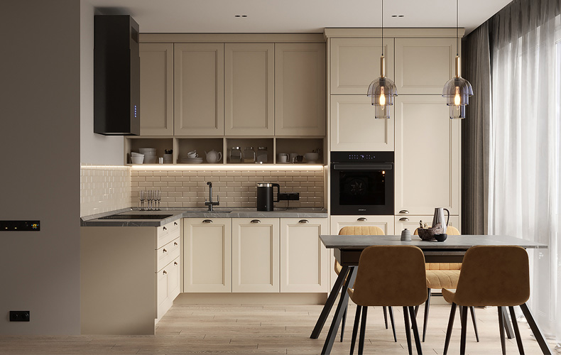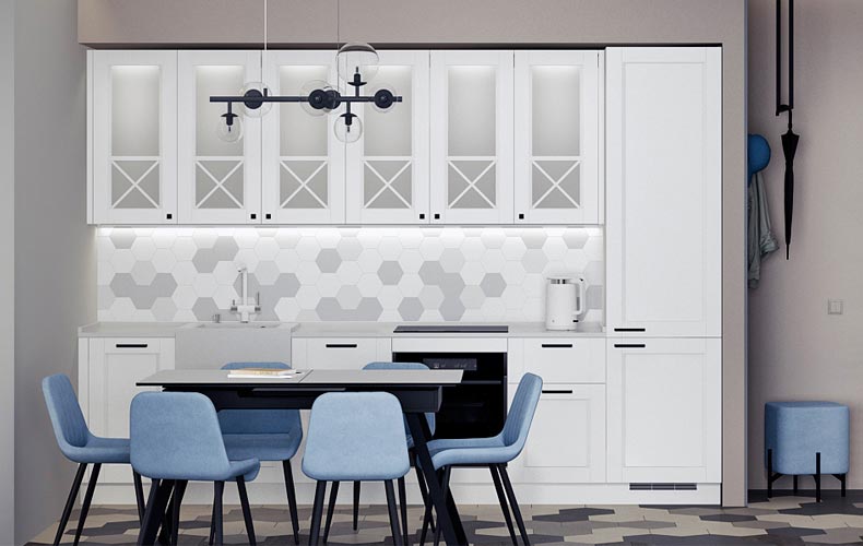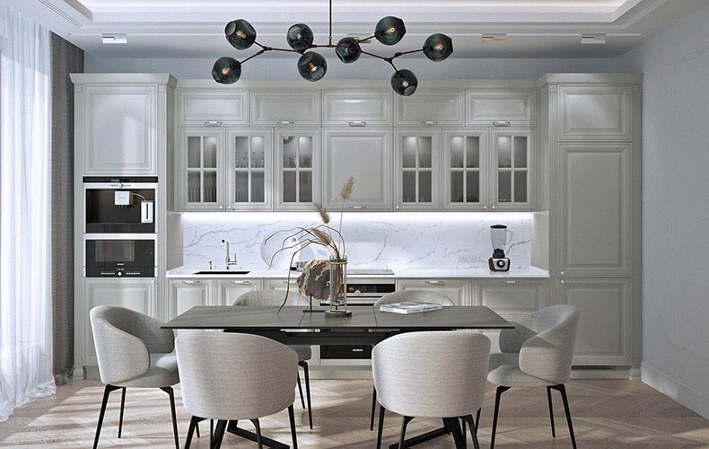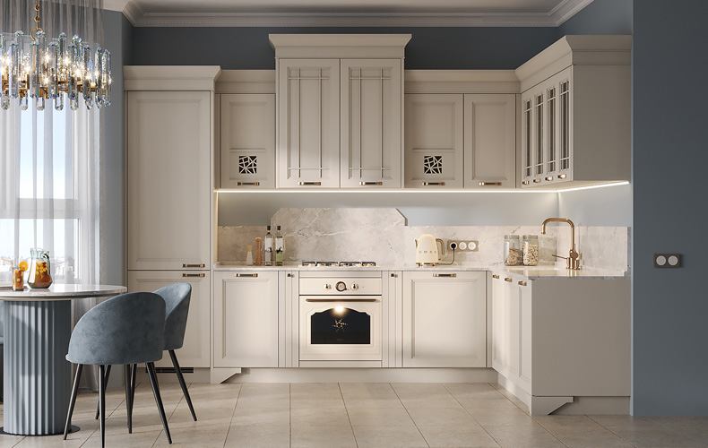Фасады — из МДФ с фрезеровкой, в эмали, или рамочные соседствуют с лаконичными линиями, современной фурнитурой, модной подсветкой. Для такого интерьера также характерны столешницы и стеновые панели под камень и нейтральная светлая классическая палитра.