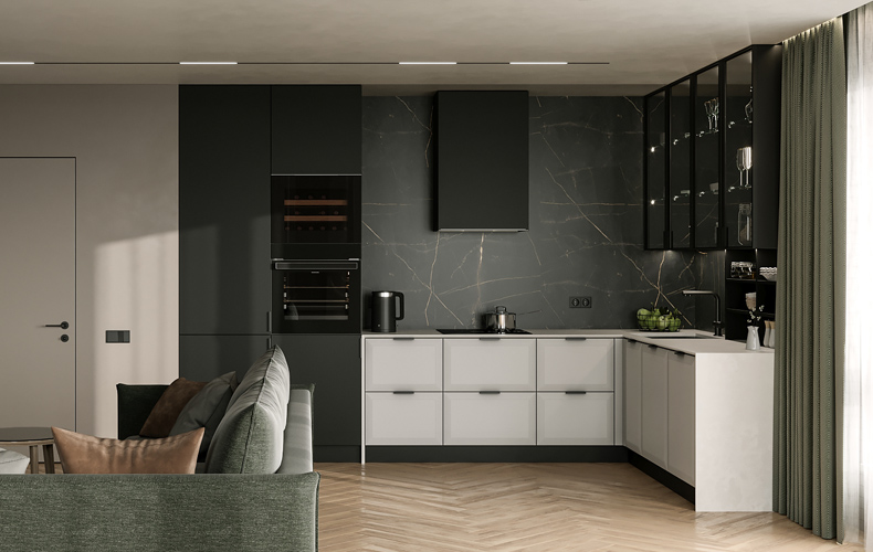 Белые фасады + черная столешница + встроенная современная техника