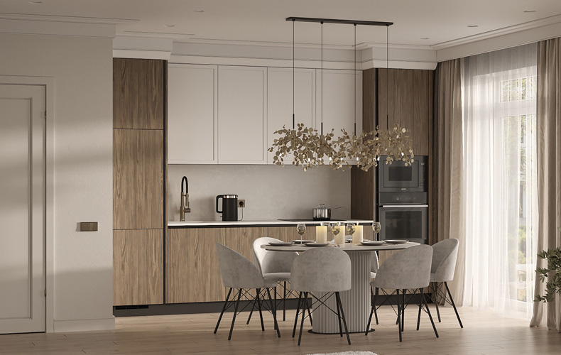 Смешение стилей в кухонных интерьерах, или эклектика — это устойчивый тренд последних лет. Дизайнеры сознательно объединяют элементы разных направлений, чтобы придать интерьеру глубину и индивидуальность, сделать его живым и человечным. Некоторые стили сочетаются лучше, чем другие. Микс классики и современного минимализма в одном интерьере, который часто называют неоклассическим — тому подтверждение.