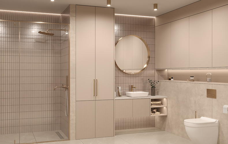 Плитка под мрамор, утонченная мебель, встроенное нишевое освещение — такое сочетание делает современный интерьер классикой на века.