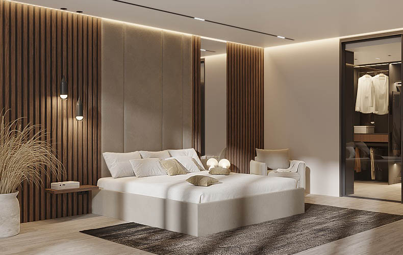 Для неоклассики характерны: мягкое изголовье, обилие текстильного декора спокойных тонов, изящные прикроватные столики, панно или молдинги на стенах.