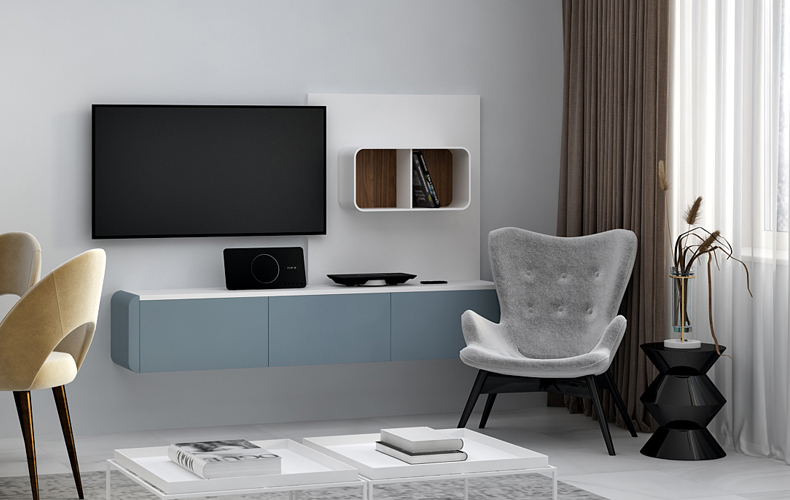 - Тумбы под телевизор. Оснащены выдвижными или открытыми полками, иногда — декоративным камином или рабочей зоной.