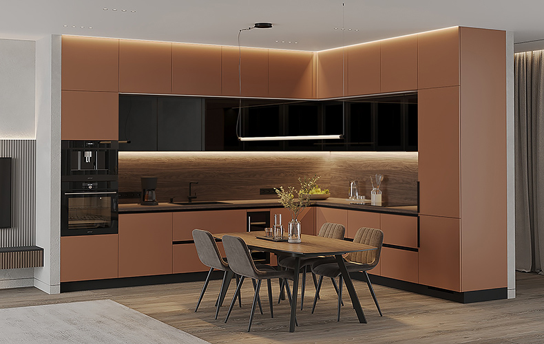 — Первоначально мы создали проект кухни в фасадах «Маттео». Он был очень красивый, и Ольга осталась им очень довольна. Мы его почти отдали в производство. Но клиентка передумала, и в результате в производство ушел другой проект, еще более роскошный и по цене в два раза дороже.