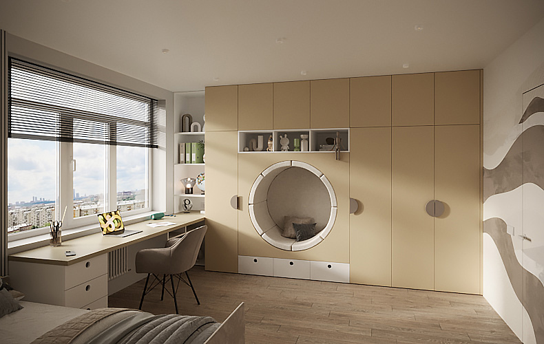 В комнатах детей однозначно присутствует большое количество полок. Детям нужно место, где можно расставить любимые игрушки, поставить учебники и тетради.