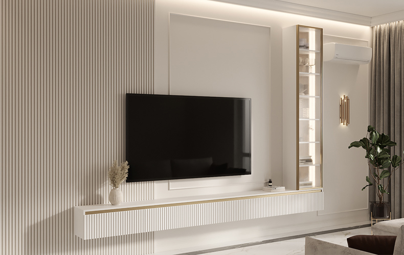 Декор, красивая посуда, книги подходят для полок. Бытовые мелочи, продуктовые запасы, провода убирают в шкаф.