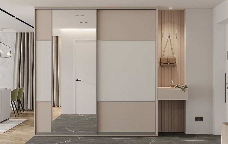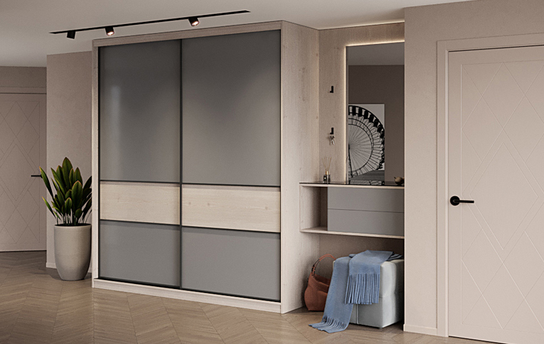 Для прихожей очень долго выбирали цвет. Мы хотели нейтральный, но в то же время не совсем серый. В салоне нам помогли, дизайнер сориентировала нас по разным ручкам, панелям, крючкам, мы выбрали все детали и ткань для пуфика.
