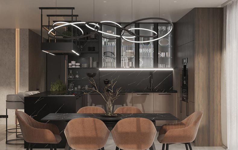 Еще один важный фактор при расчете размеров барной стойки — это планировка кухни. Этот элемент интерьера отлично подходит для зонирования пространства, но важно помнить и о проходах — их ширина должна быть достаточной, чтобы комфортно проходить в рабочую зону, например, с подносами.