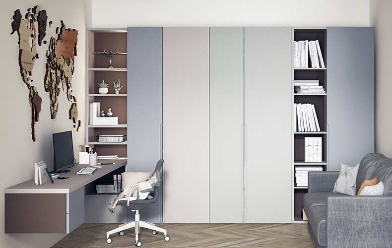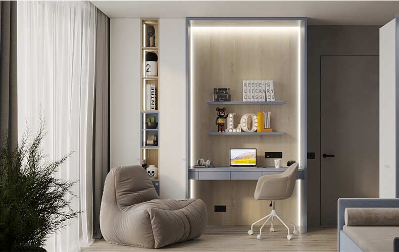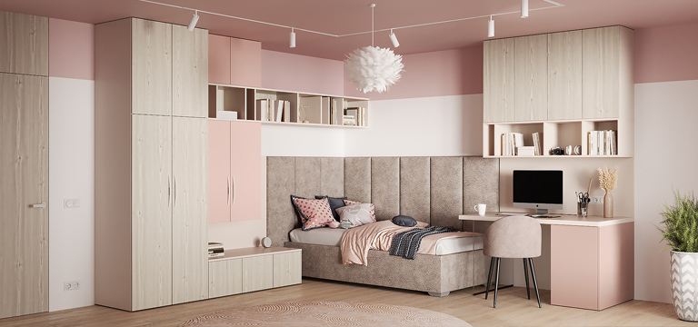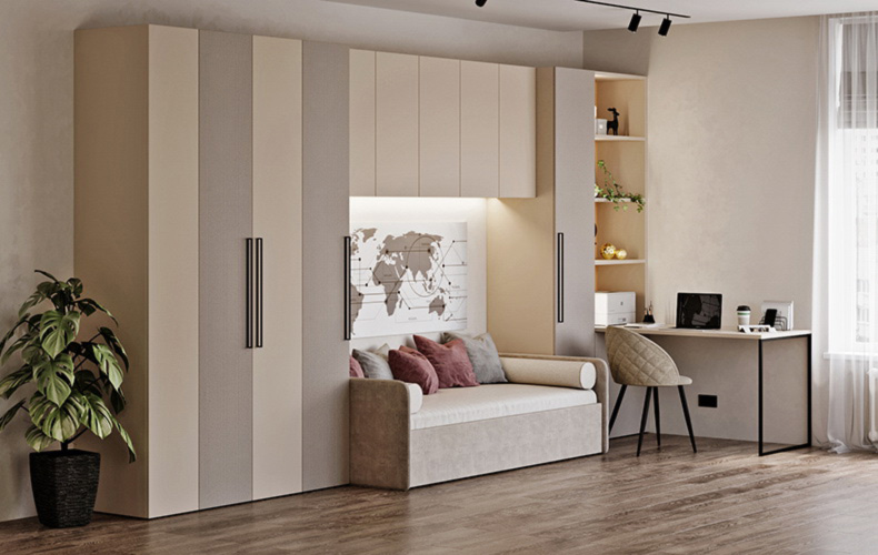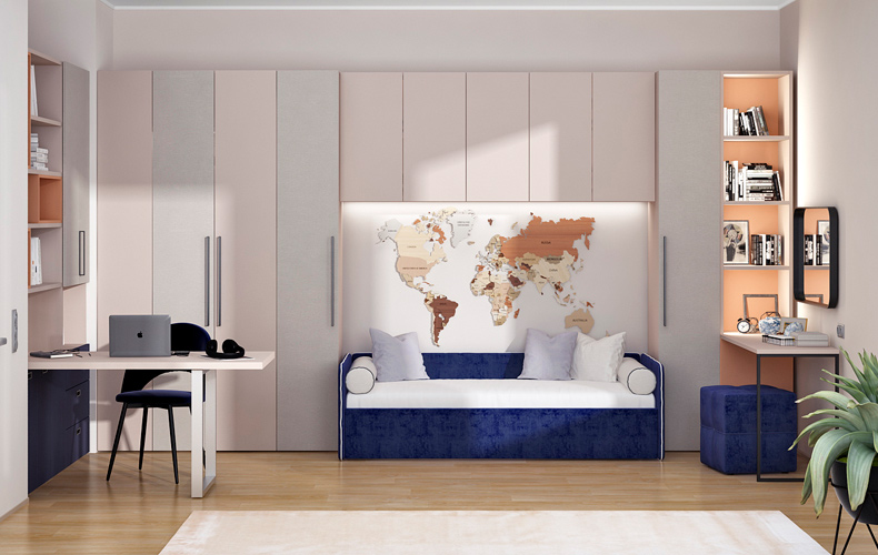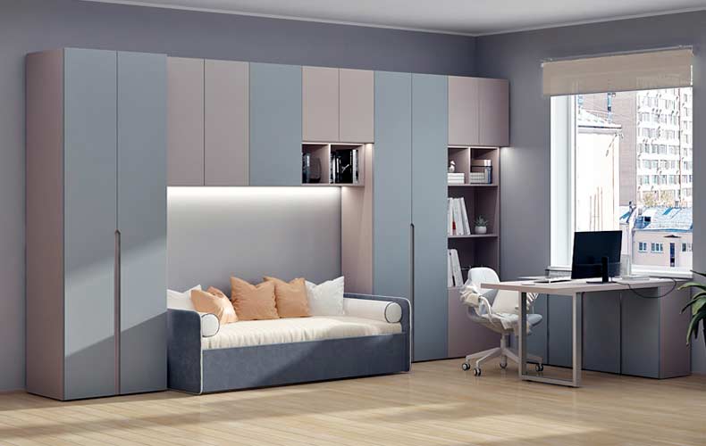 Мебель с диваном-кроватью в комнату подростка в серых тонах. Диван-кровать, стол письменный, шкаф со множеством полок и ящиков, которые помогают подростку организовать хранение собственных вещей, школьных принадлежностей и книг. Комплект мебели имеет свою локальную подсветку. Диван-кровать Мичела очень компактен и удобен - он оснащен механизмом плавного открывания и местом для хранения белья.