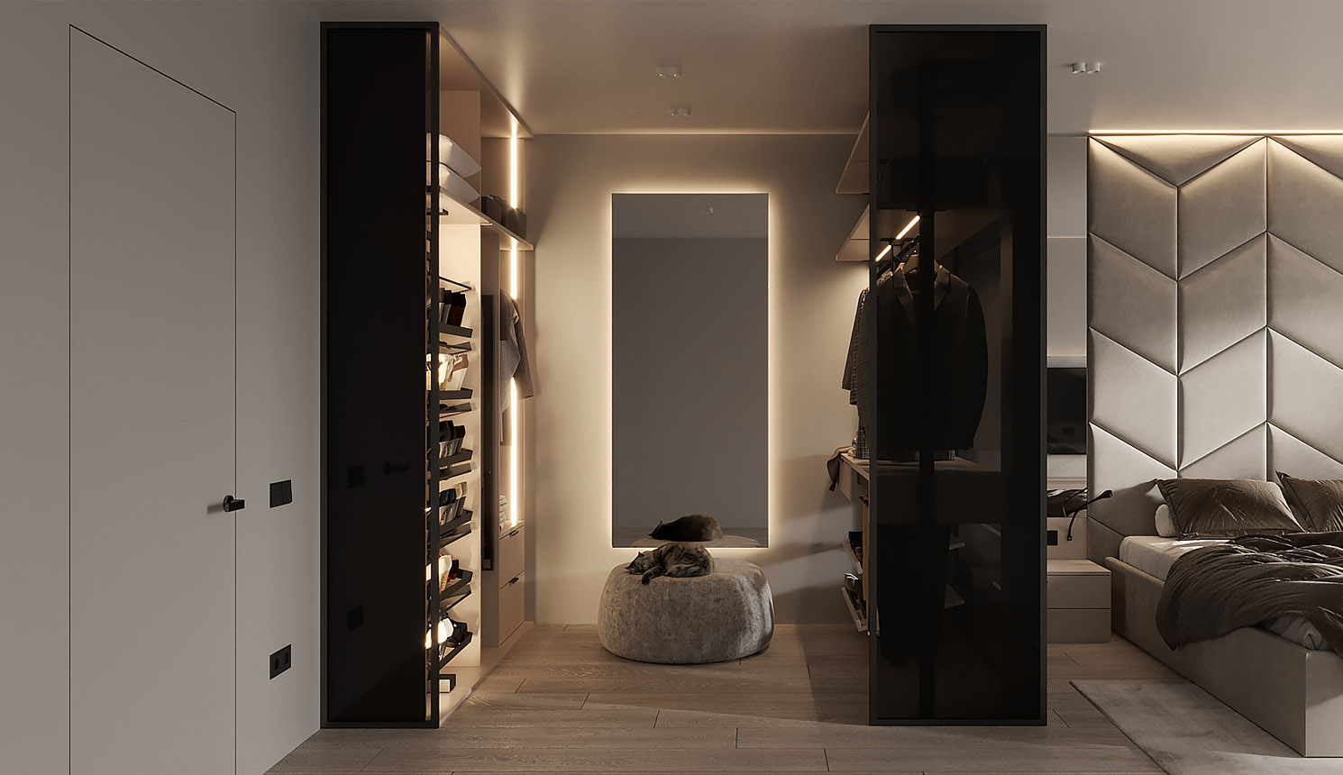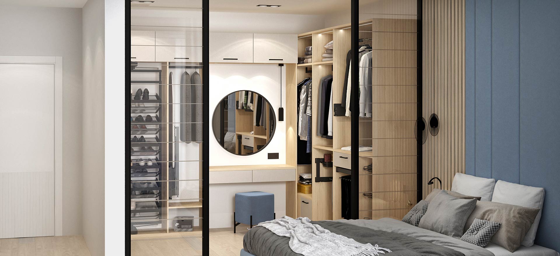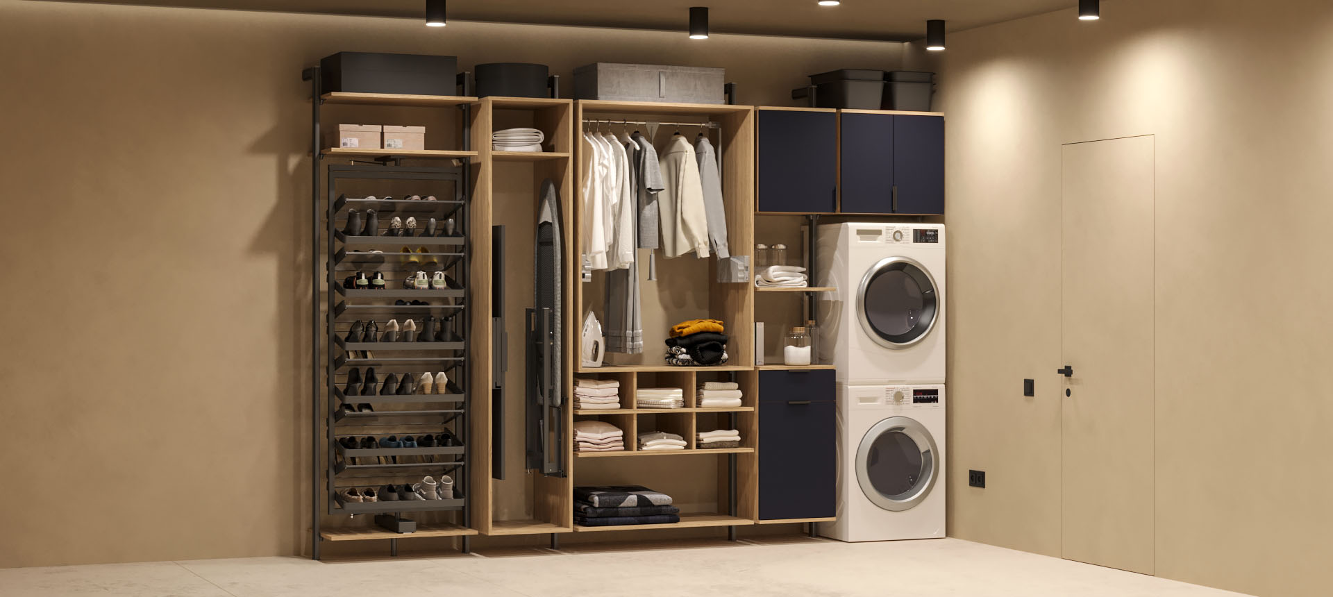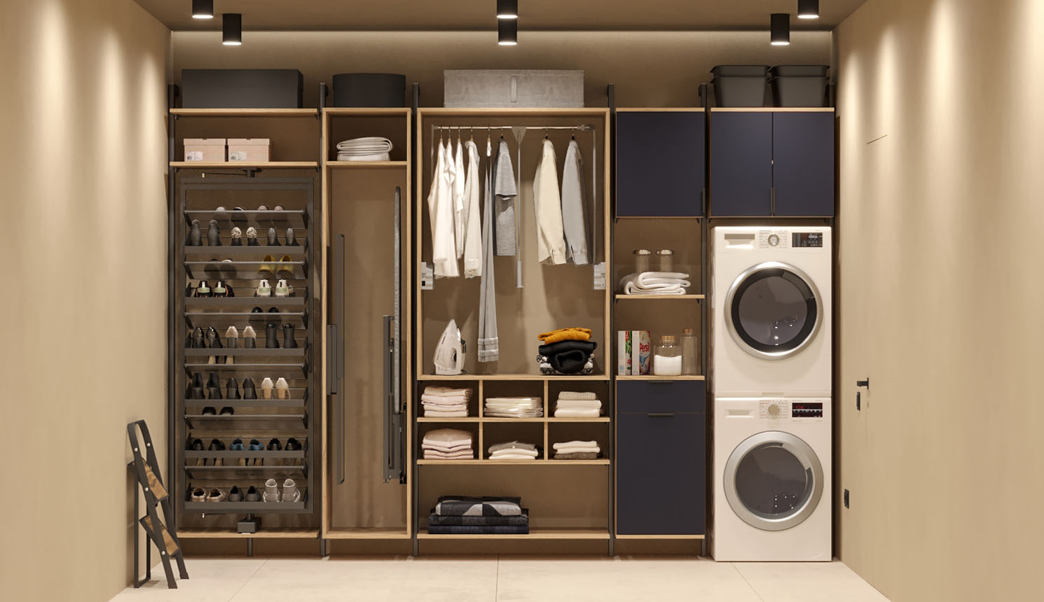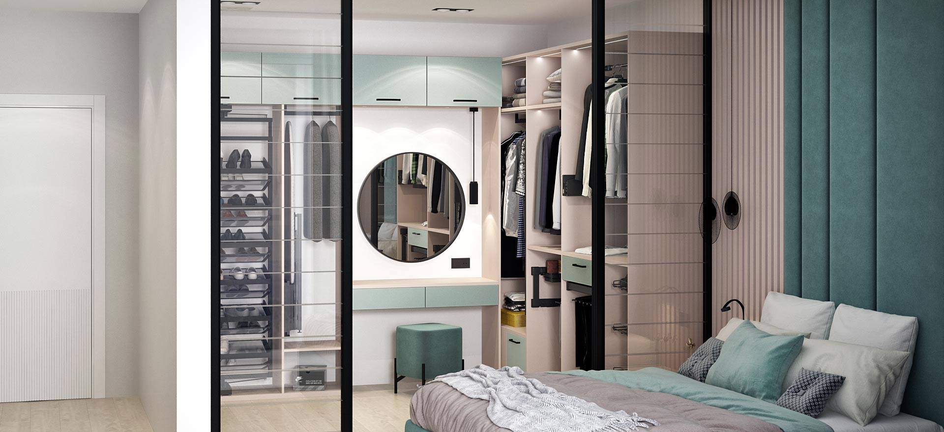 - в шкафу-купе, в котором поместится компактный вариант гардеробной, оснащенный гладильной доской и другими необходимыми изделиями.