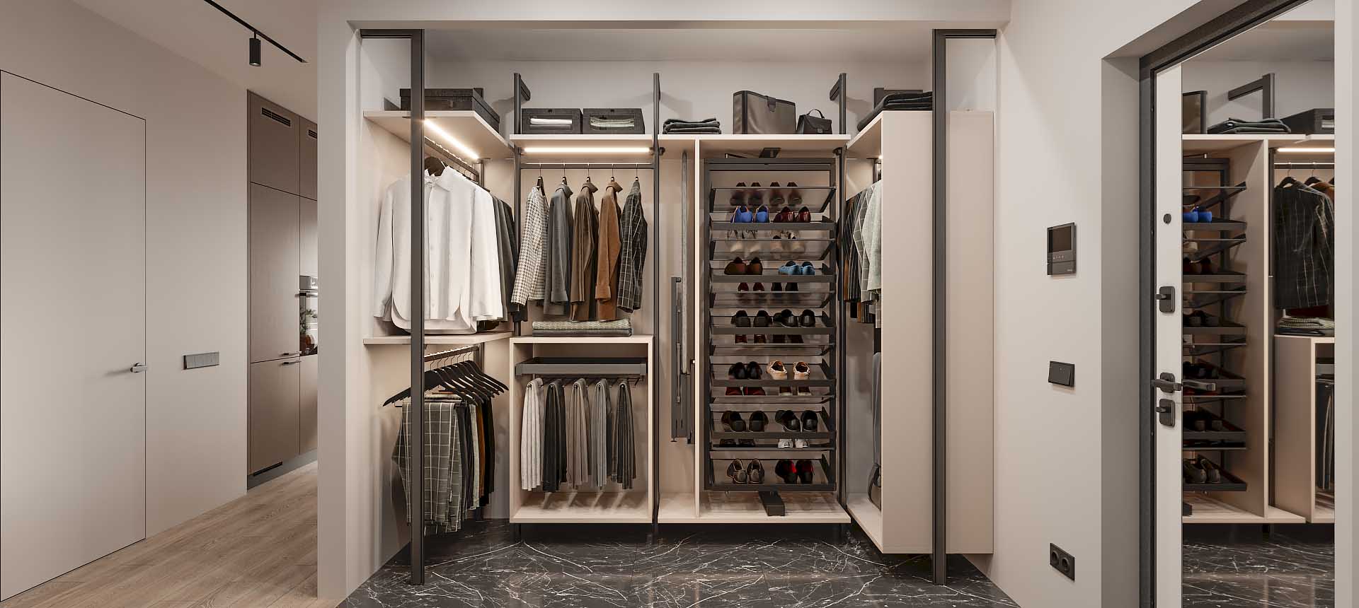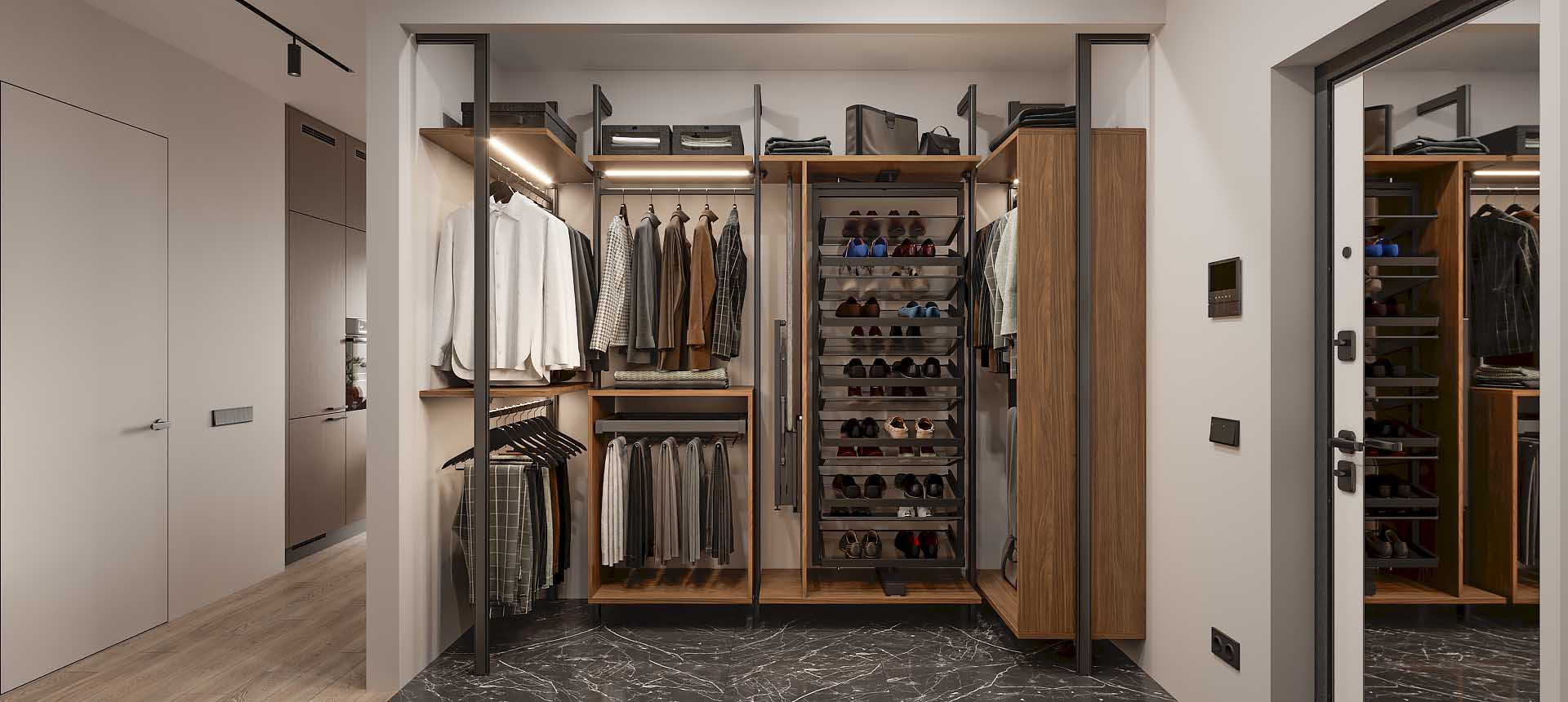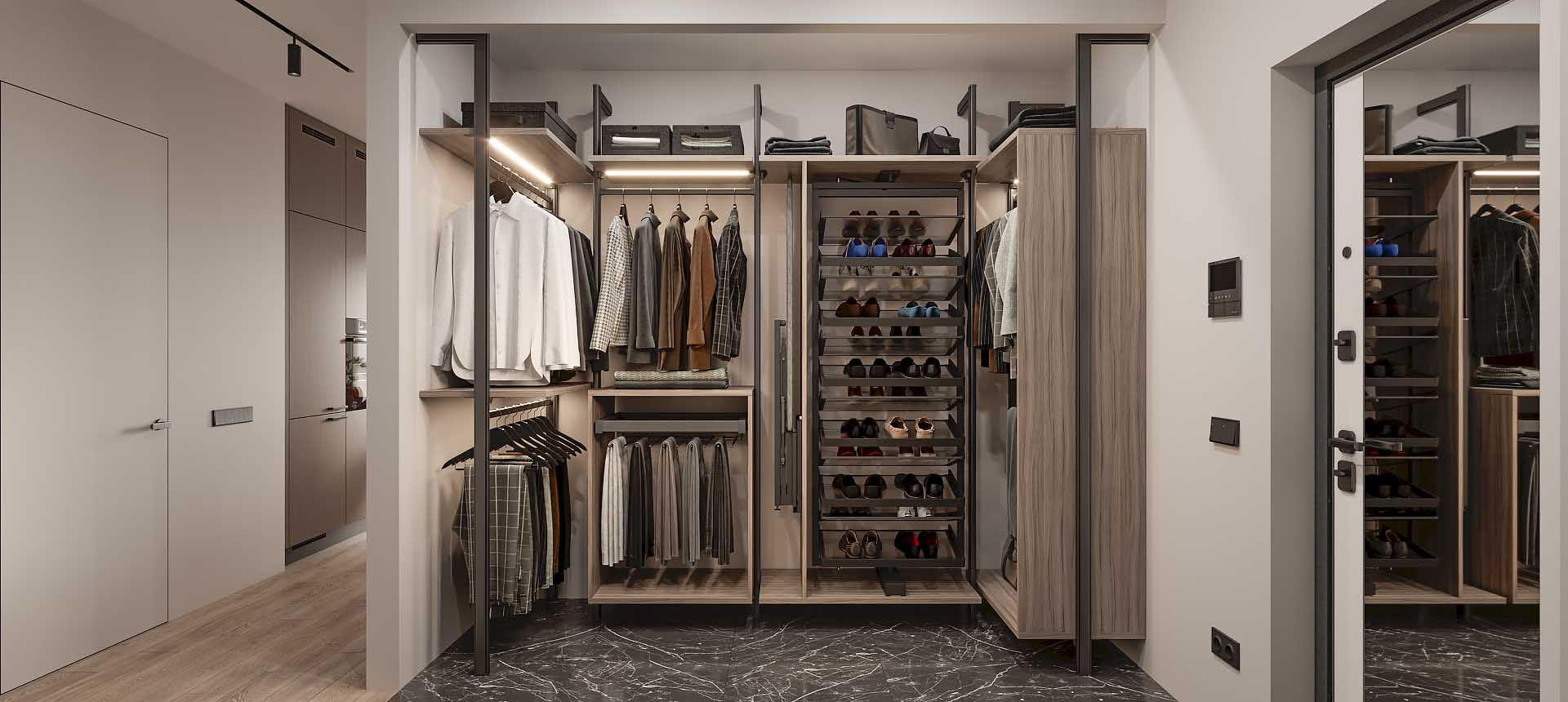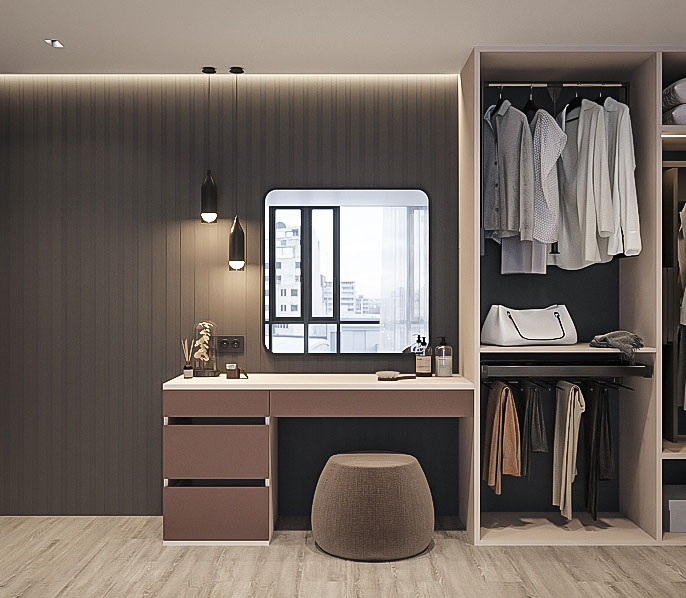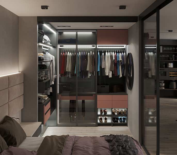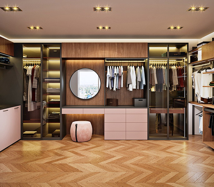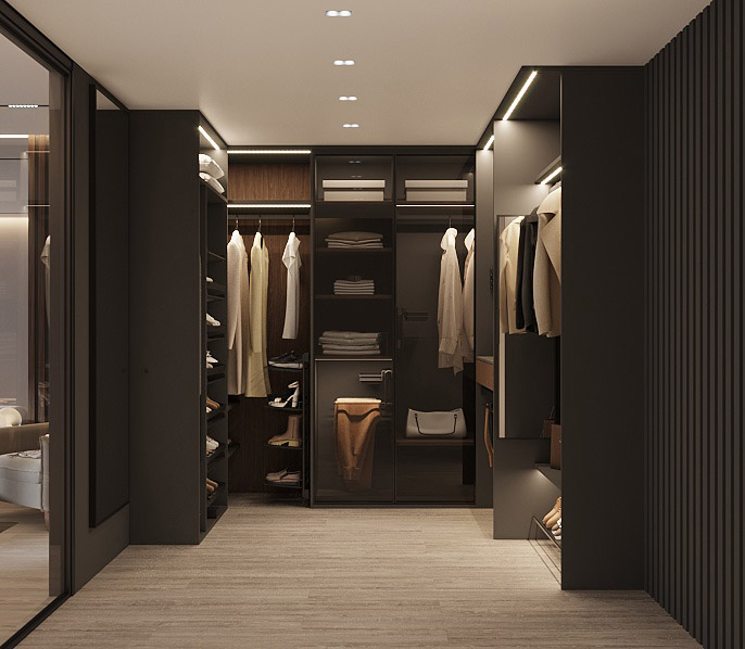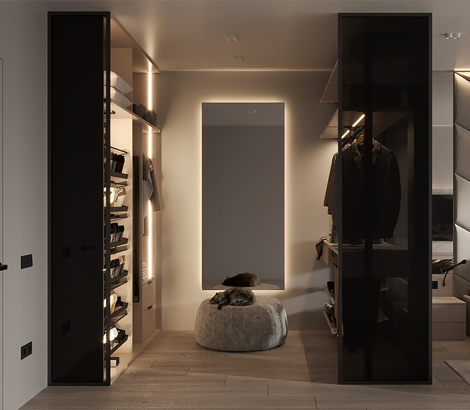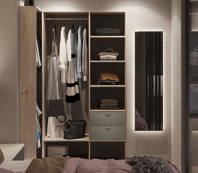 Гардеробная — это удобное пространство для организации хранения и выбора одежды и аксессуаров, где все предметы под рукой и при этом скрыты от посторонних глаз. Но к его созданию нужно подходить продуманно. Компания «Стильные Кухни и Интерьеры» проектирует гардеробные по индивидуальному заказу. Это позволяет подобрать удобное расположение для систем хранения вещей даже в небольшом жилище.