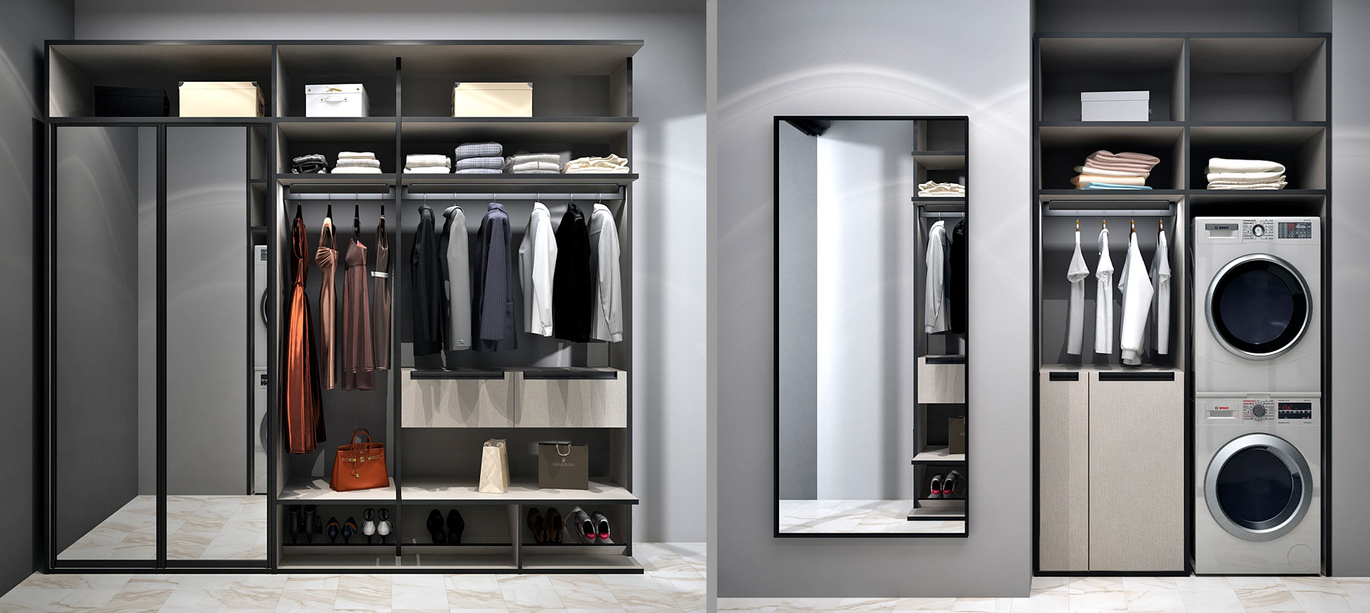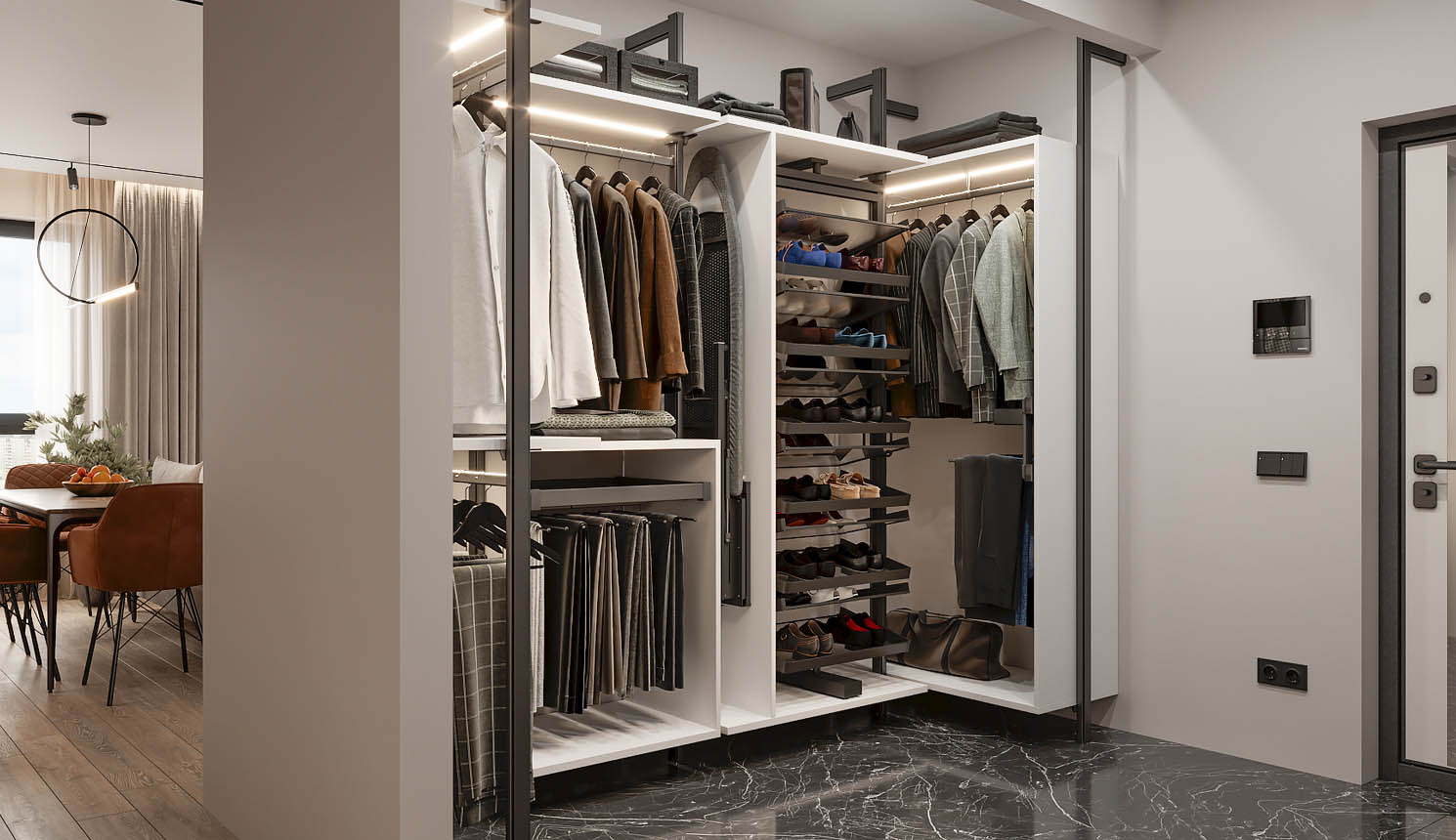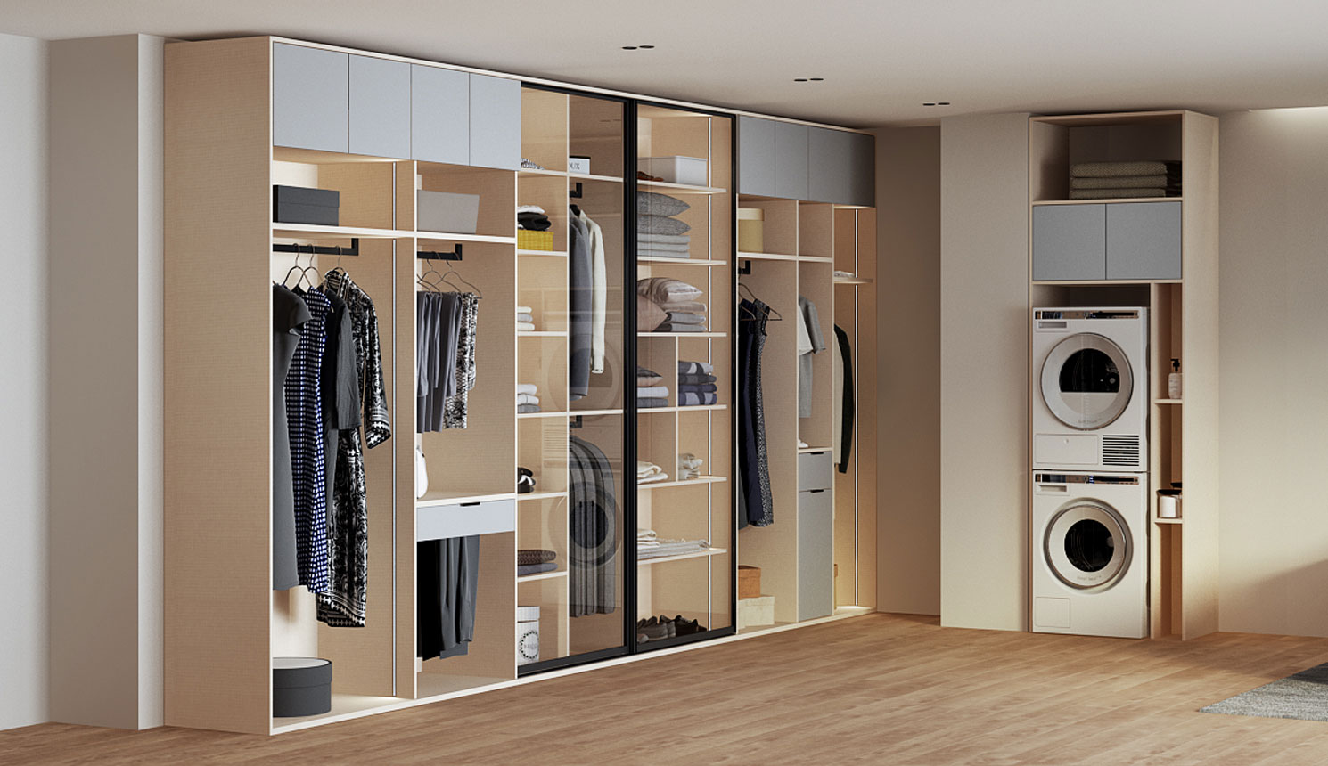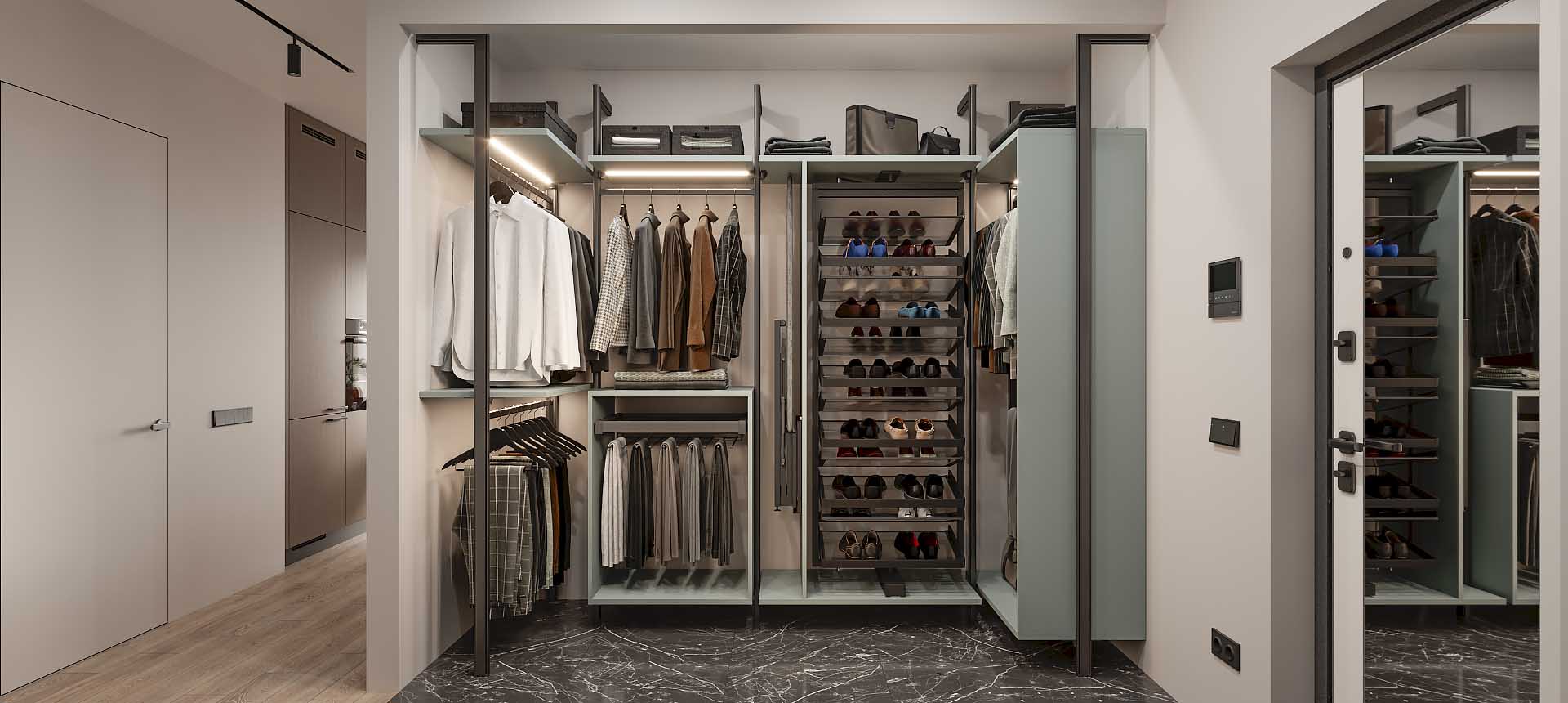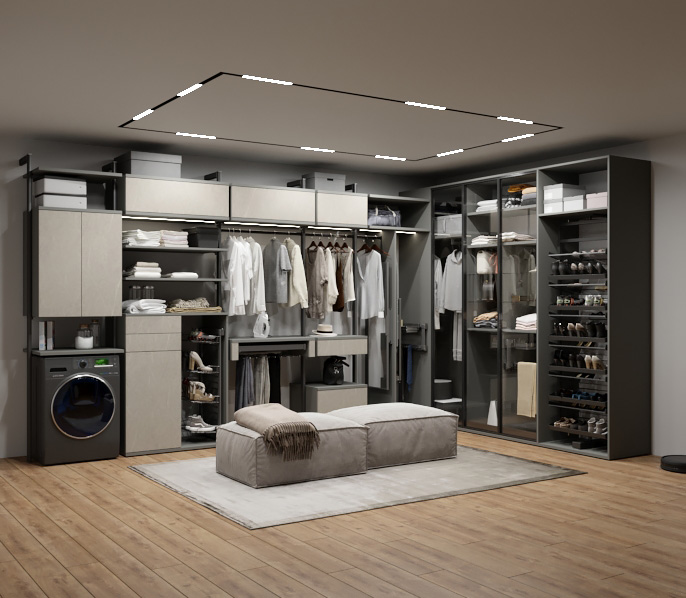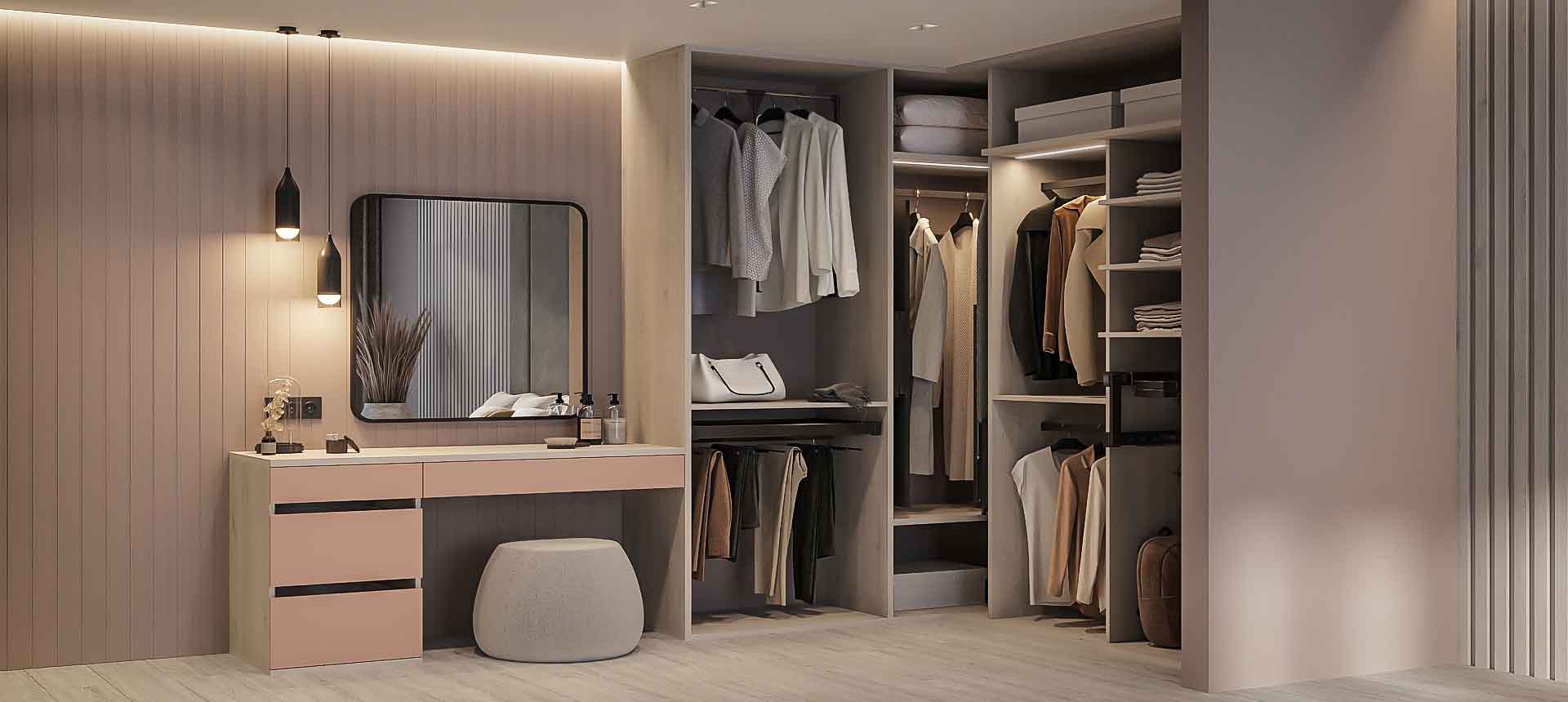 Гардеробная — это удобное пространство для организации хранения и выбора одежды и аксессуаров, где все предметы под рукой и при этом скрыты от посторонних глаз. Но к его созданию нужно подходить продуманно. Компания «Стильные Кухни и Интерьеры» проектирует гардеробные по индивидуальному заказу. Это позволяет подобрать удобное расположение для систем хранения вещей даже в небольшом жилище.