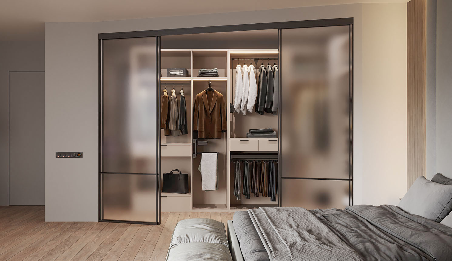 - в спальне за раздвижными панелями;