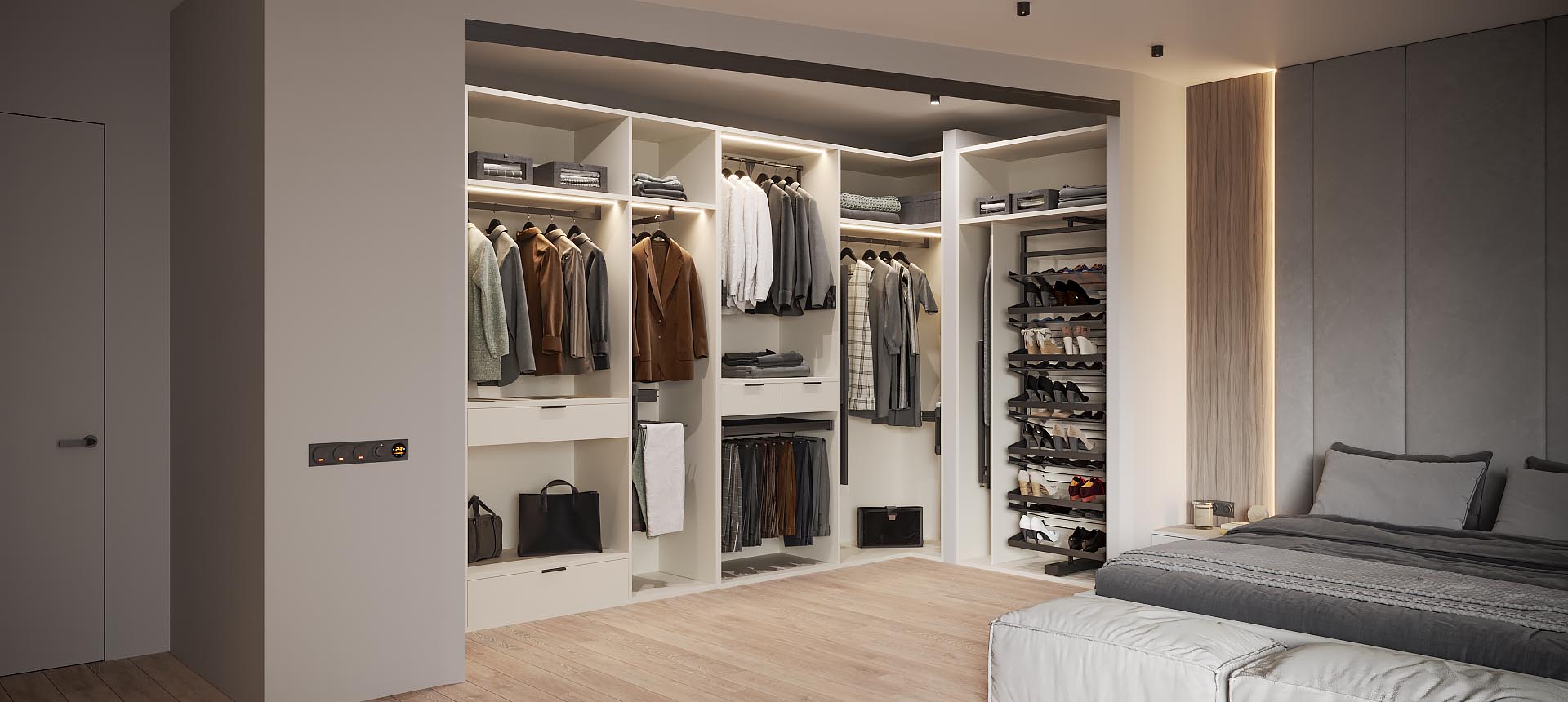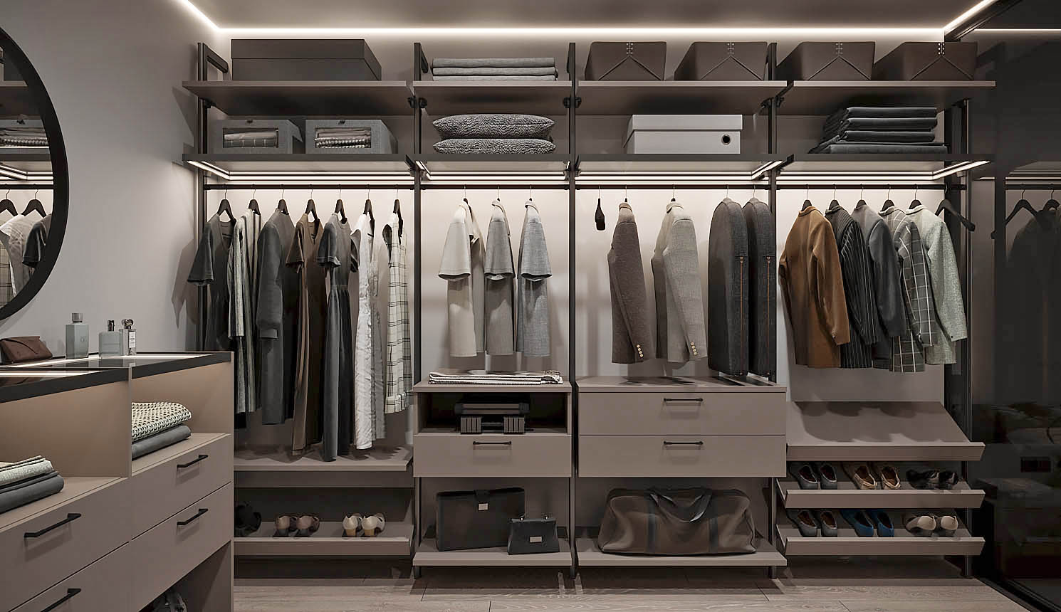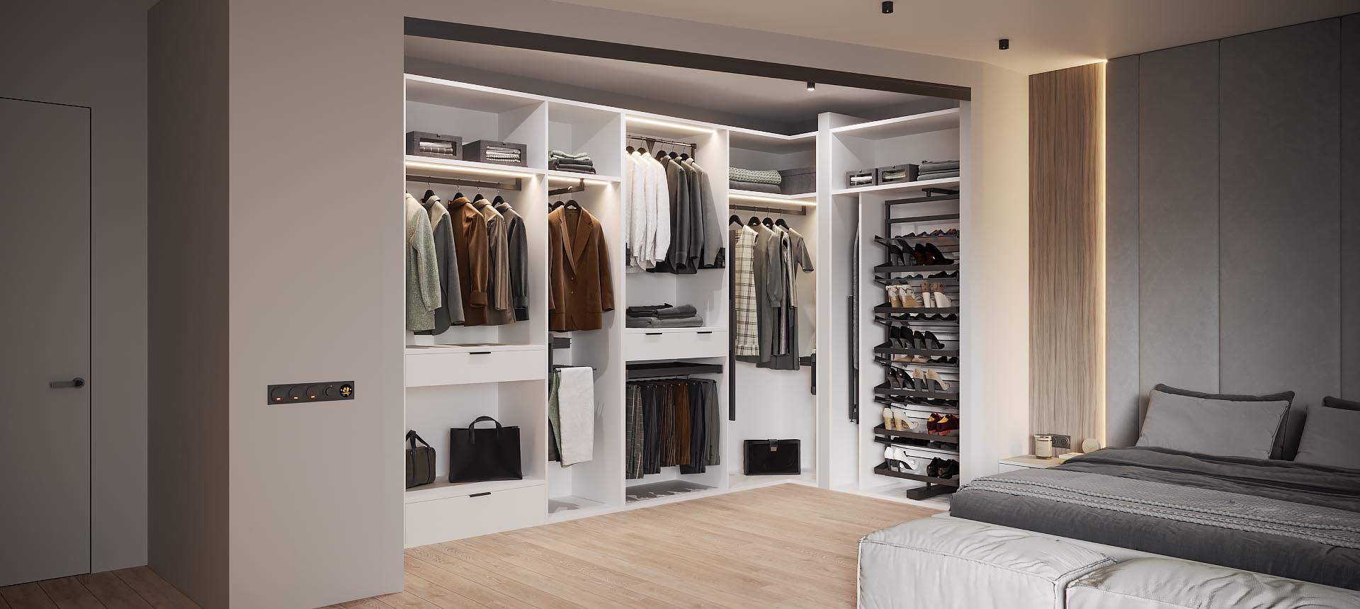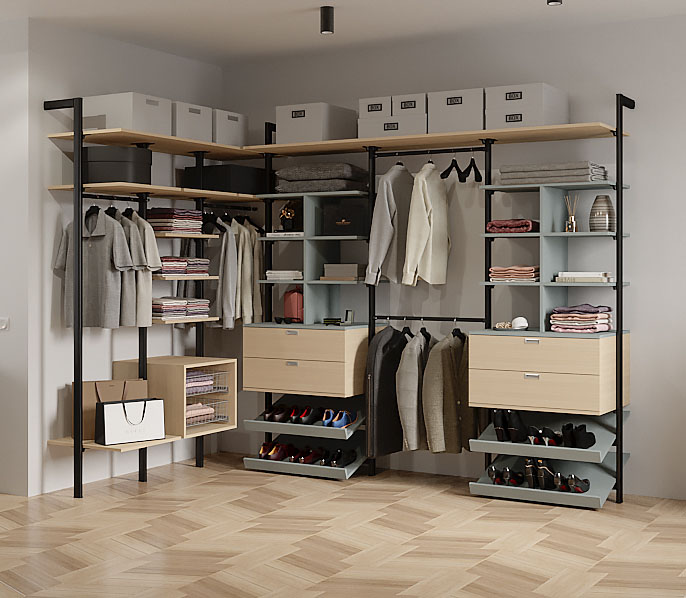 Наша компания производит гардеробные на заказ любых конфигураций и в любых стилях: от классической гардеробной в отдельном помещении до открытых систем хранения в стиле лофт.