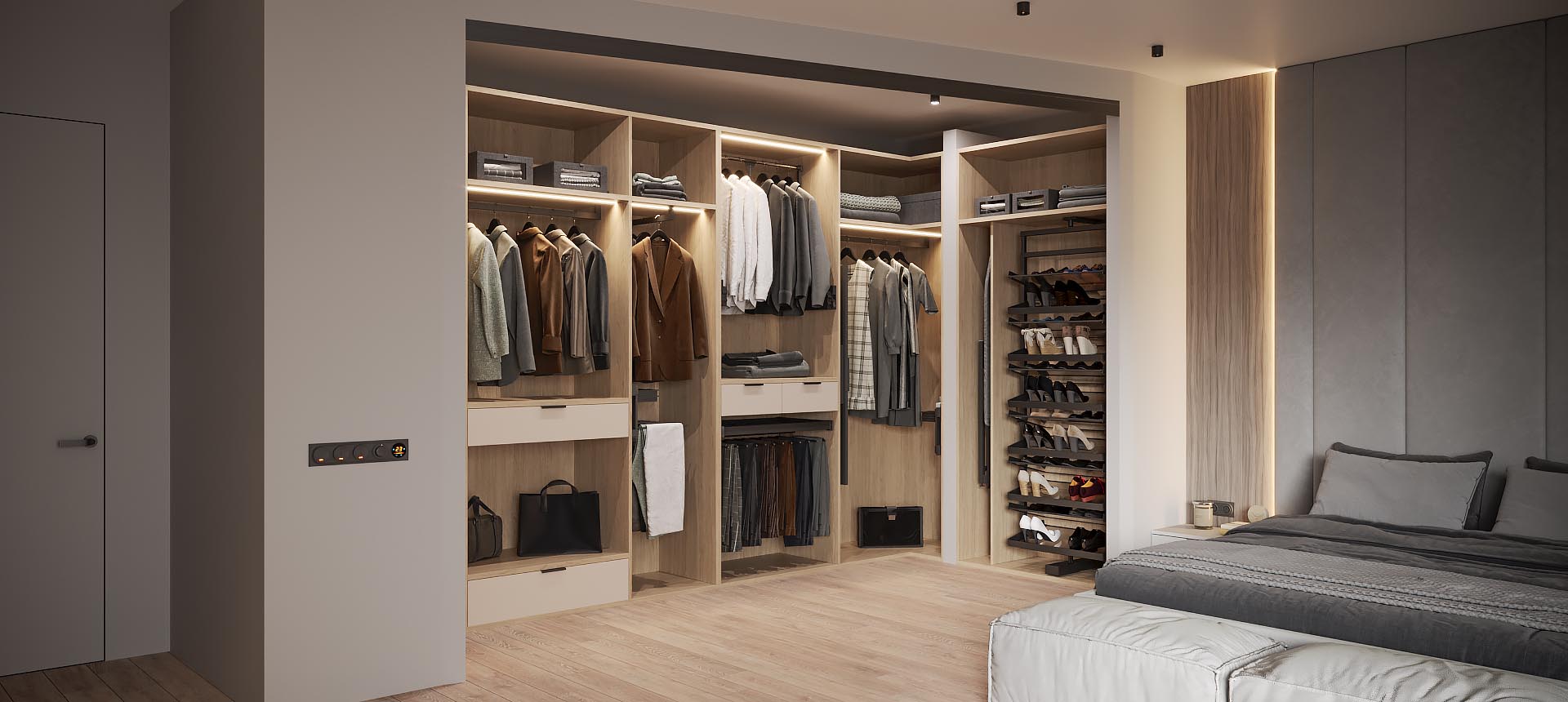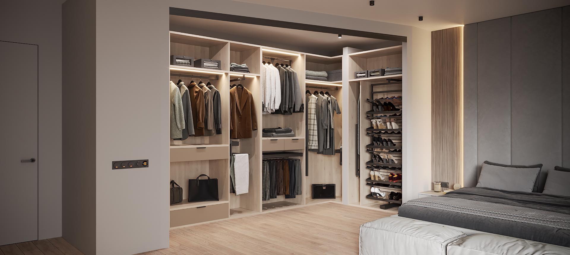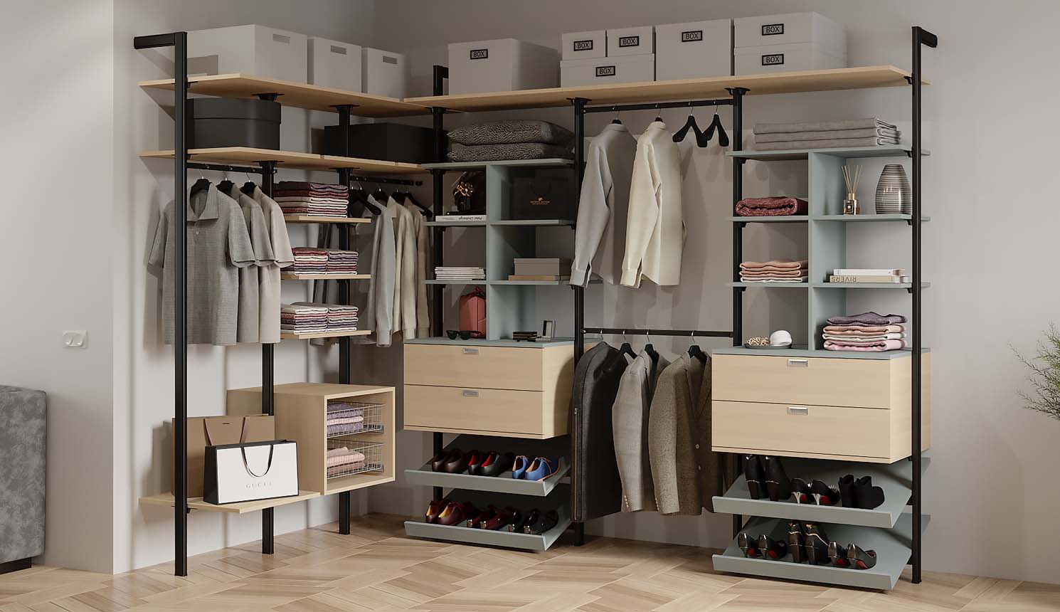 Наша компания производит гардеробные на заказ любых конфигураций и в любых стилях: от классической гардеробной в отдельном помещении до открытых систем хранения в стиле лофт.