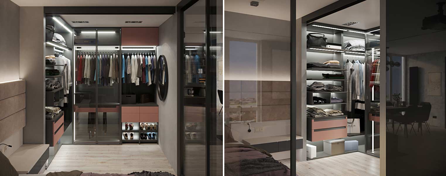 Гардеробную можно расположить в нише в спальне. Занимает не так много места и при этом получается вполне вместительная и функциональная гардеробная. Гардеробная имеет полки и ящики для хранения вещей, обуви, аксессуаров, штанги для одежды. Гардеробная оснащена светодиодной локальной подсветкой для удобства поиска и укладывания вещей. Для разграничения пространства используются полупрозрачные двери с раздвижным механизмом.
