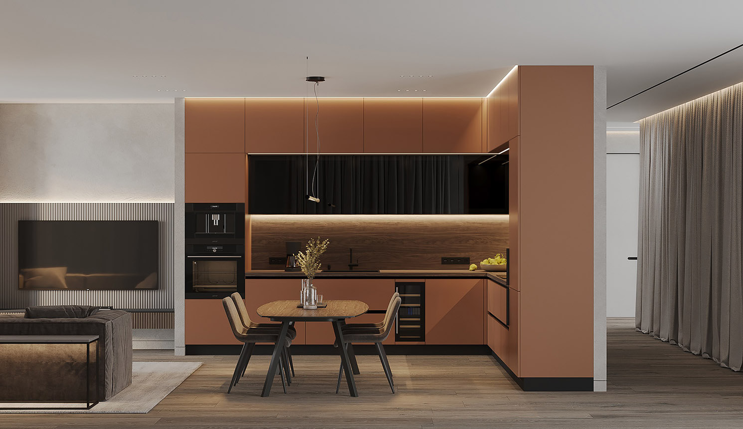 Красивая кухня с золотыми акцентами в двухкомнатной квартире бизнес-класса
