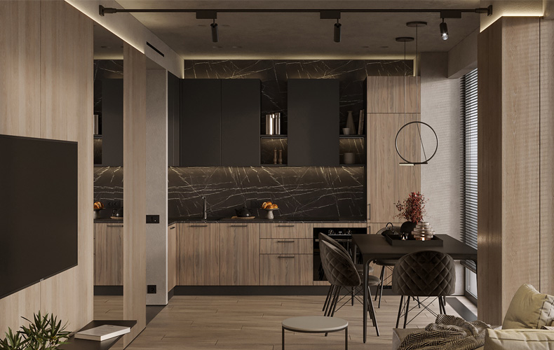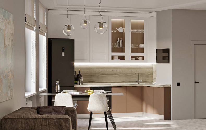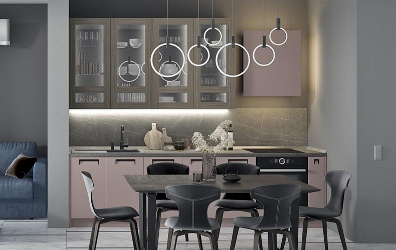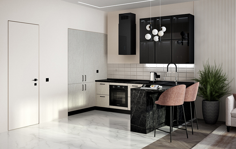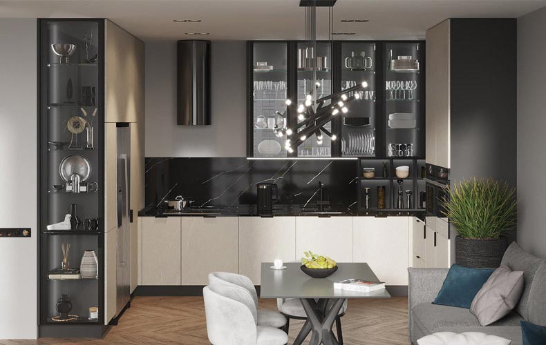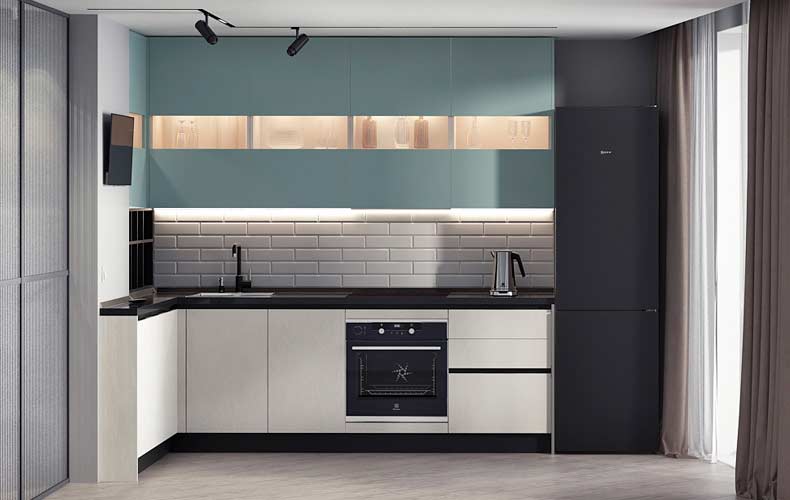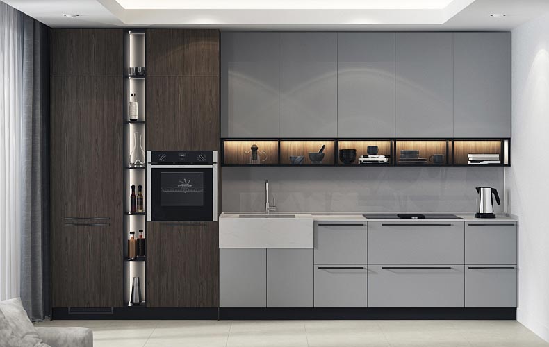 Кухонный гарнитур Фабио идеально подходит для интерьеров в стиле модерн или минимализм. Отличительные черты дизайнерского оформления мебели – строгие линии, геометрически выверенные пропорции, монохромные оттенки и отсутствие лишних деталей. Предметы можно разместить вдоль одной стены, при этом всё необходимое будет под рукой.