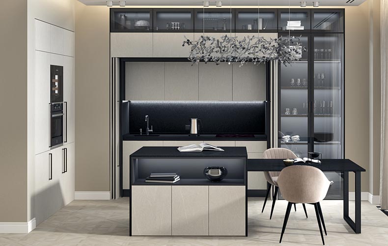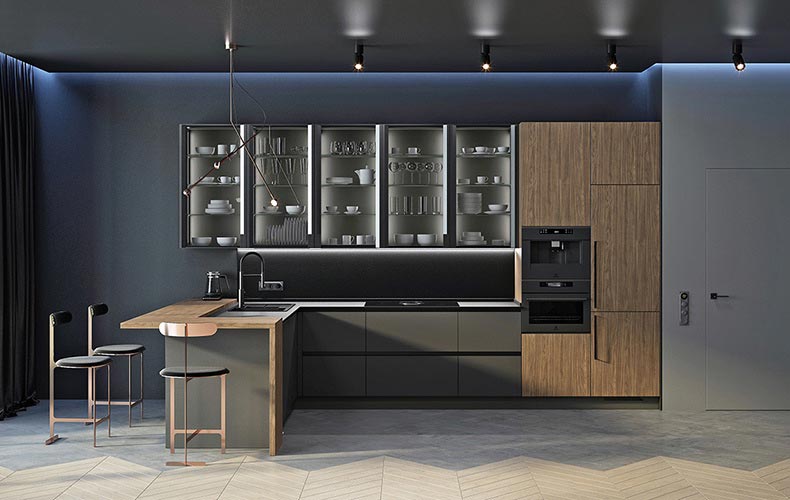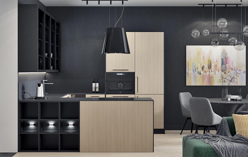 Комбинация вариантов отделки позволяет разделить кухню на зону для приготовления пищи и место для хранения принадлежностей. Древесный декор напольной системы хранения прекрасно сочетается с однотонными ламинированными фасадами Egger. Также в конструкции предусмотрены открытые полки из алюминиевой рамки и подсветка.
