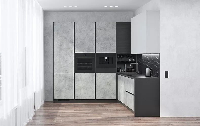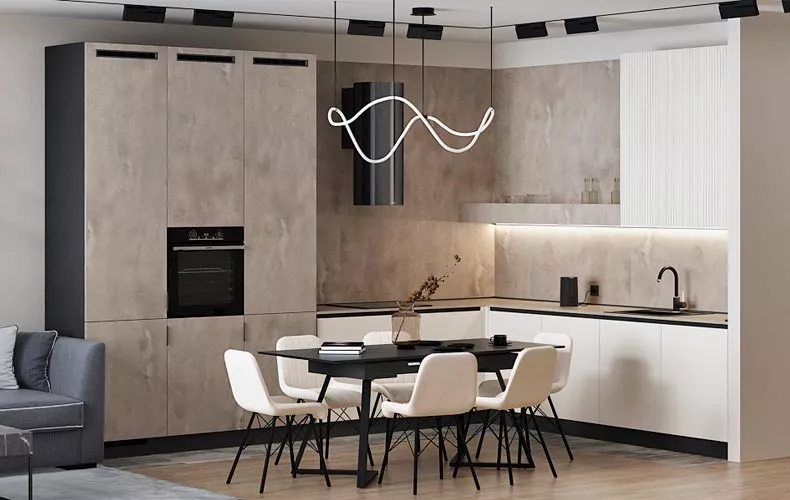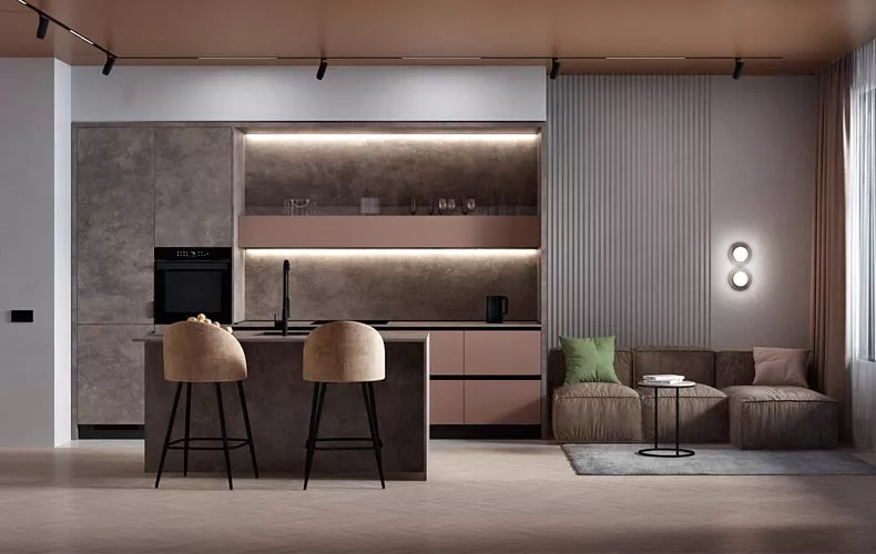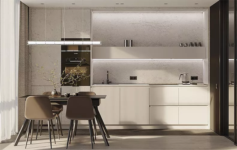 Кухня Клодия прямой планировки в бежевых тонах с текстурой под камень. Фасады выполнены из влагостойкой ЛДСП в облицовке HPL пластиком. Кухонный гарнитур содержит две высокие мебельные колонки под встроенную технику, холодильник и хранение. В рабочей зоне расположены мойка со смесителем и варочная поверхность. Верхние навесные шкафы представляют собой невысокие длинные шкафы, которые не загромождают пространство, а верхнюю часть можно использовать в качестве открытой полки.