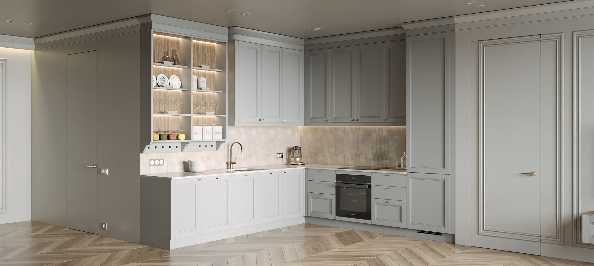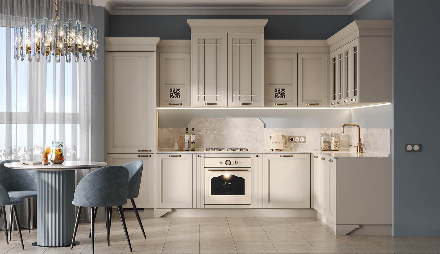 Красивая кухня с золотыми акцентами в двухкомнатной квартире бизнес-класса