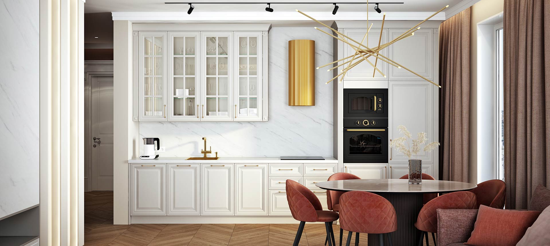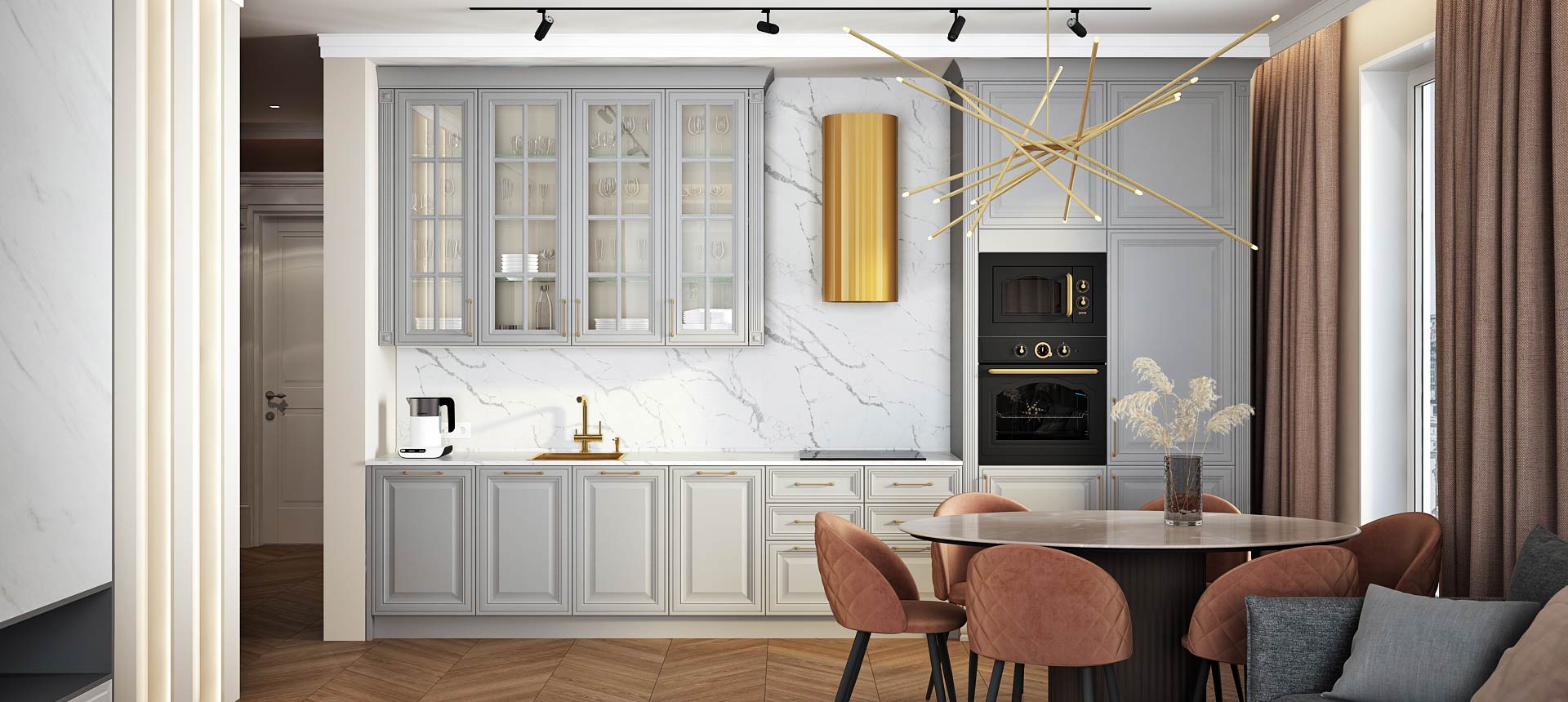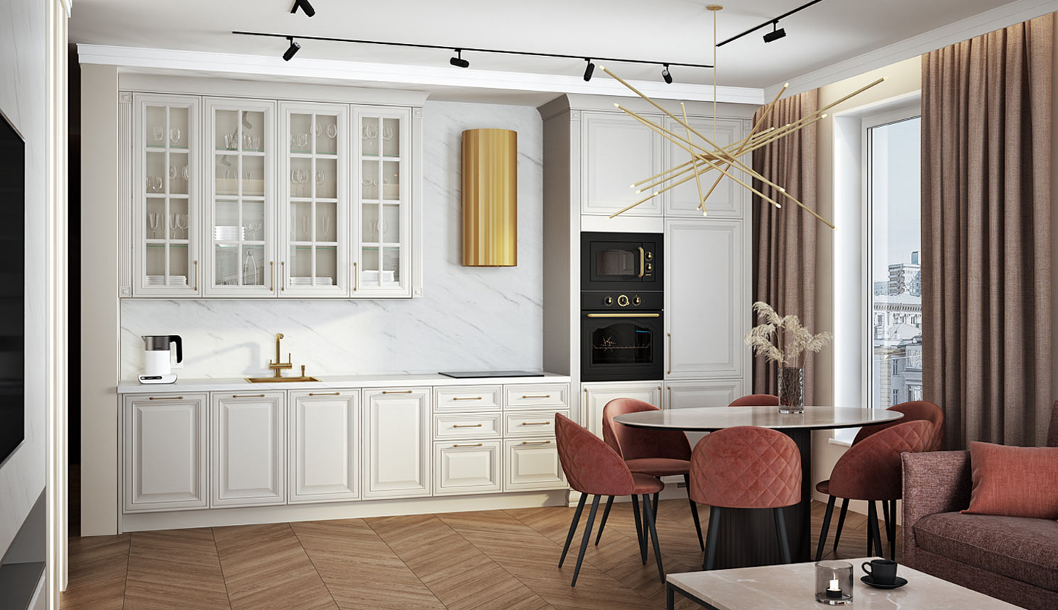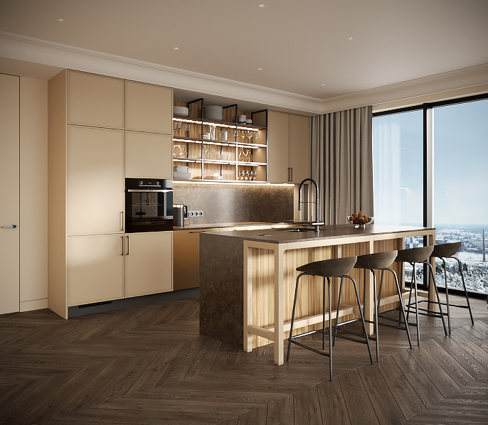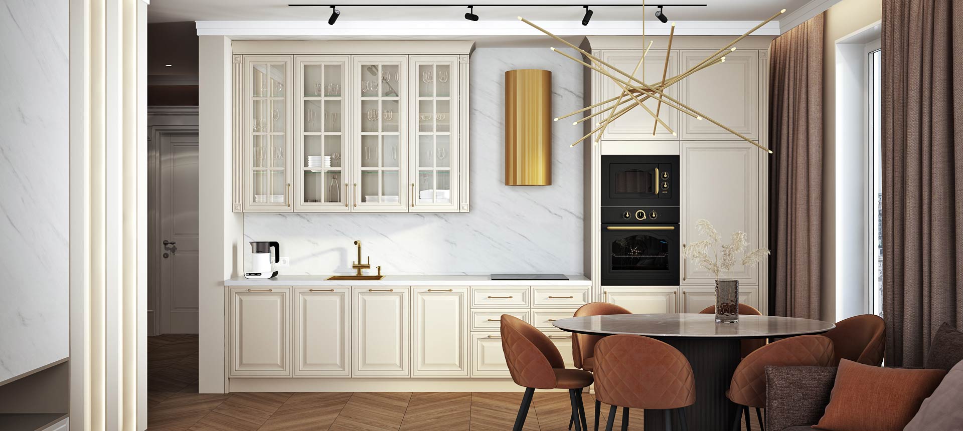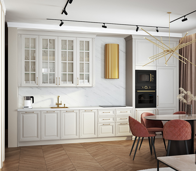 • Красивая кухня с золотыми акцентами в двухкомнатной квартире бизнес-класса