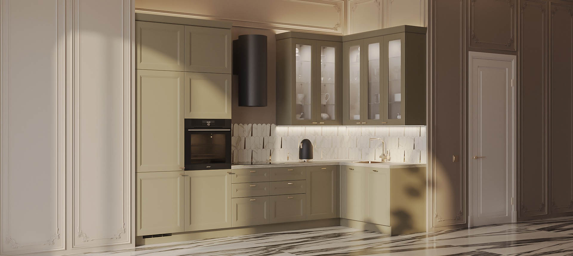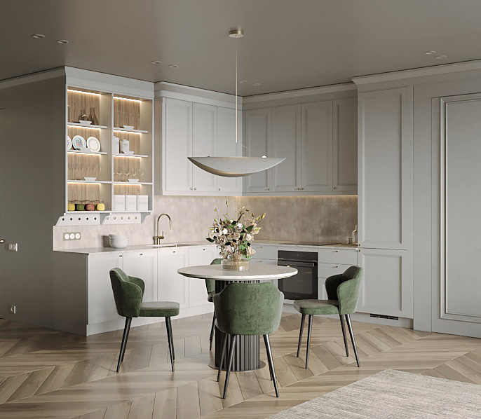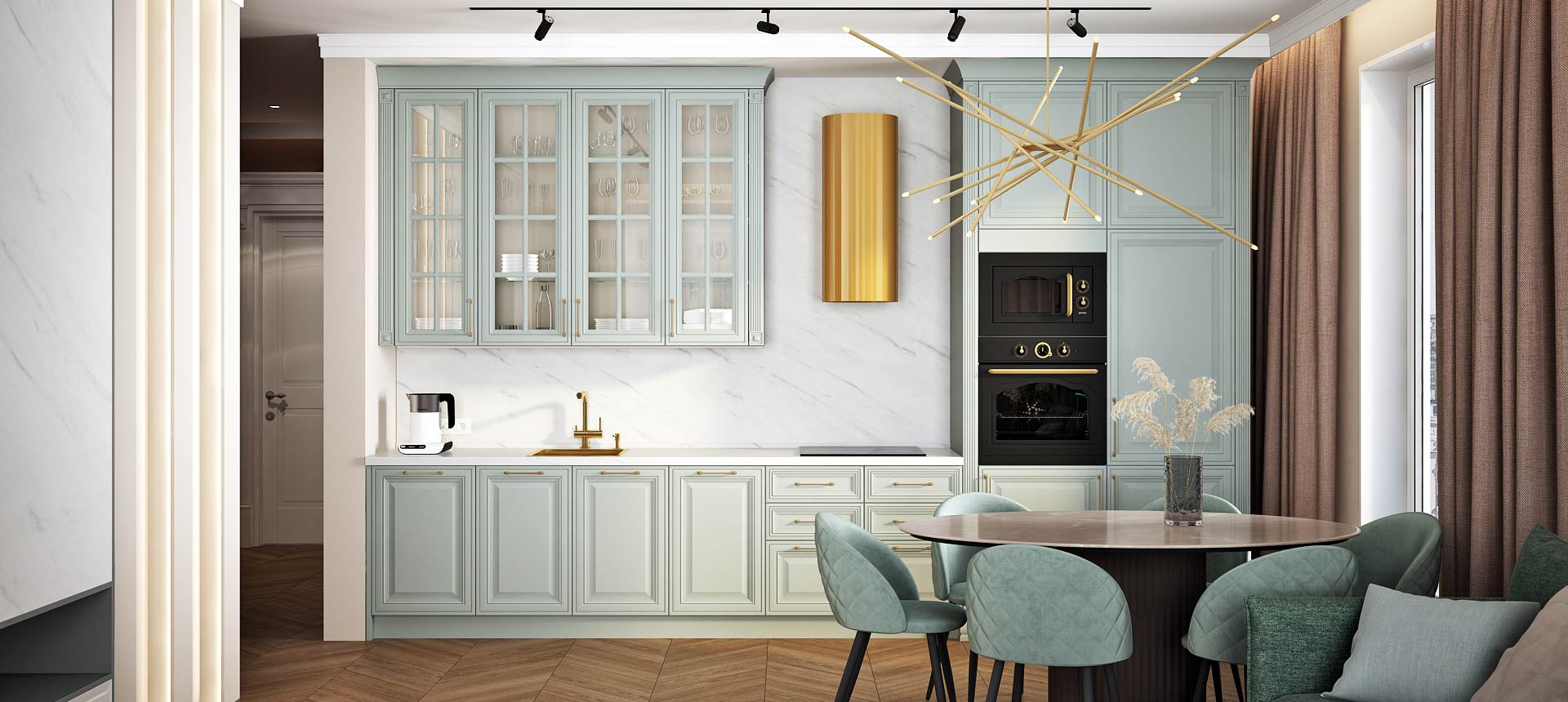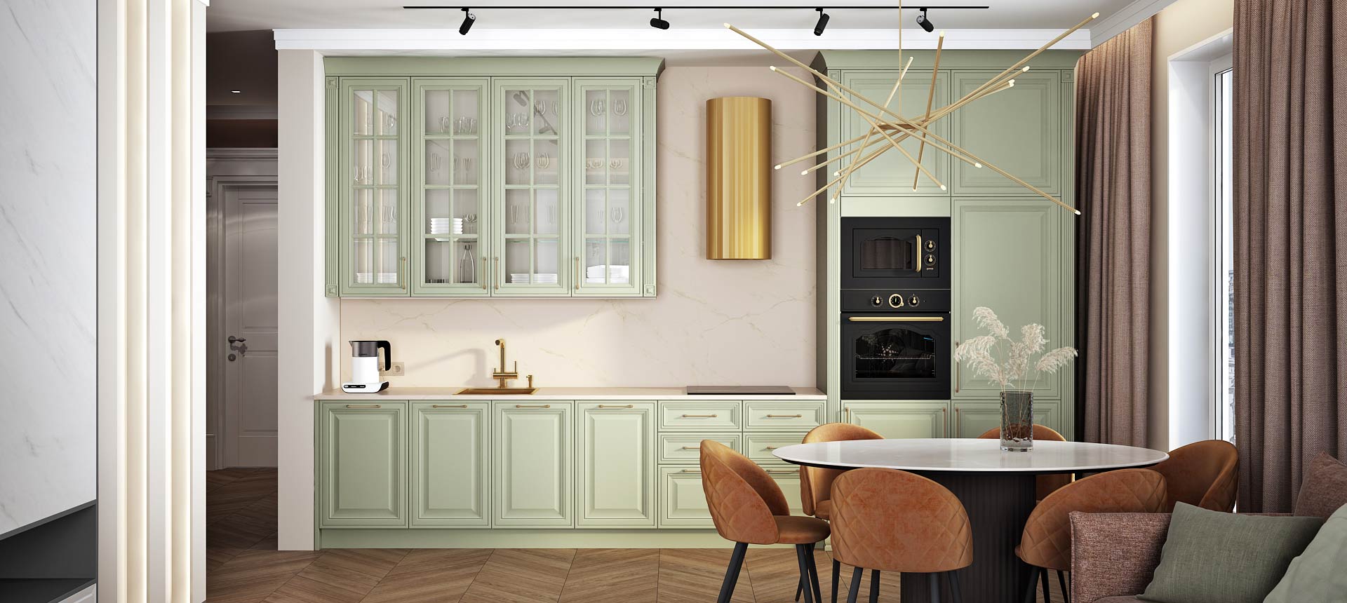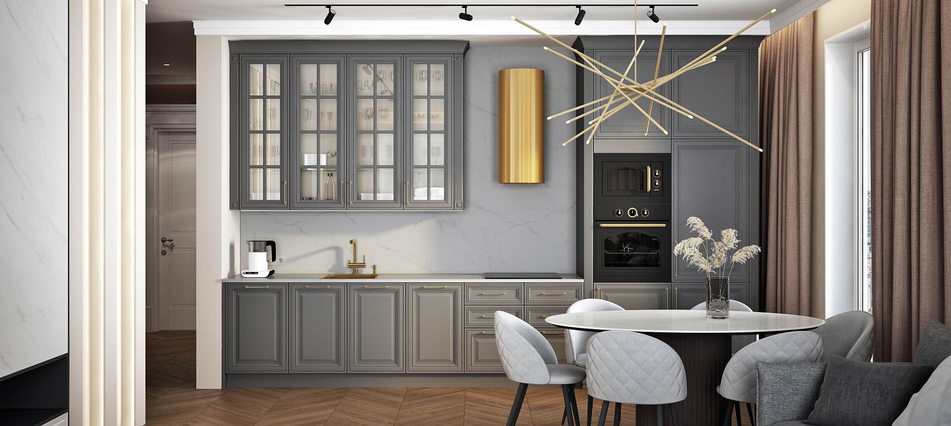 • Красивая кухня с золотыми акцентами в двухкомнатной квартире бизнес-класса