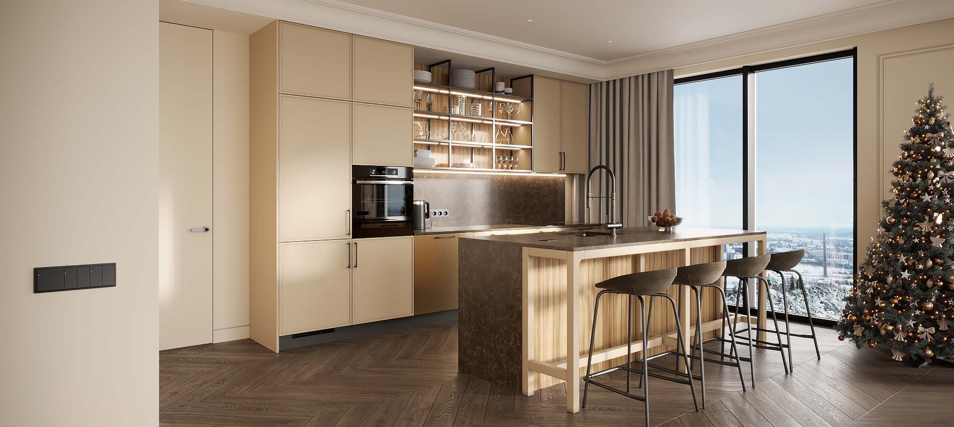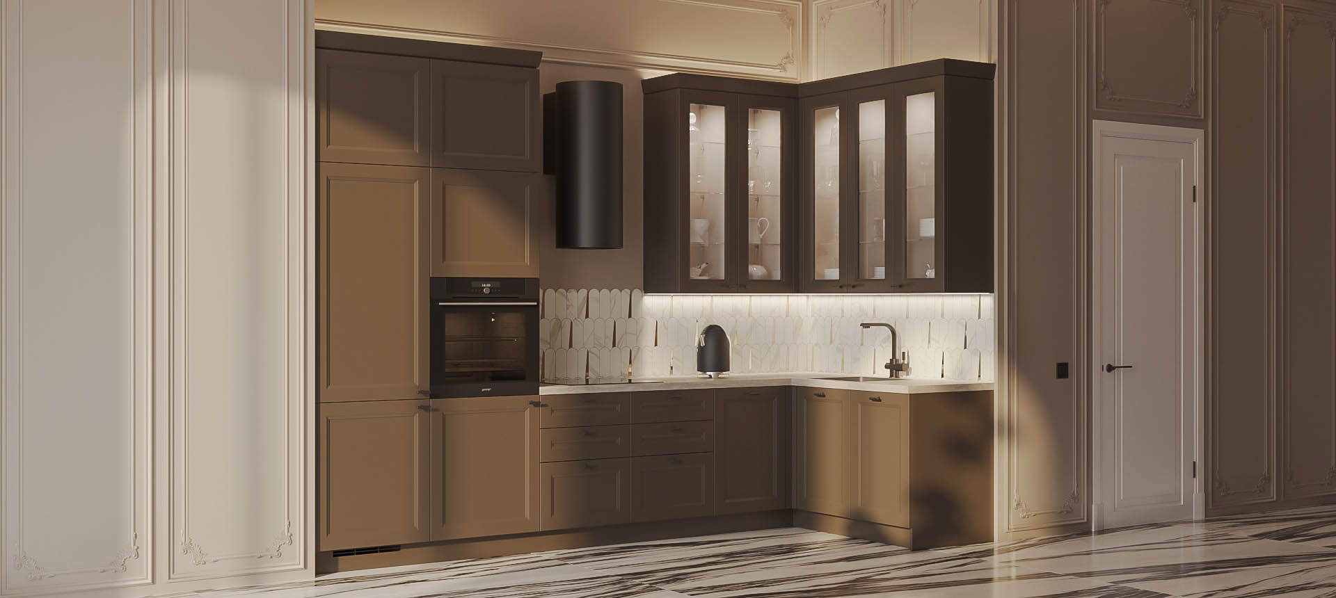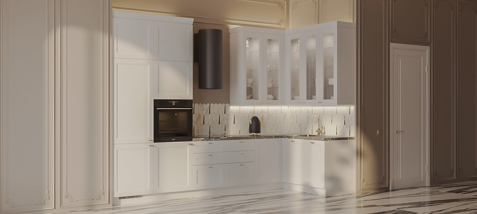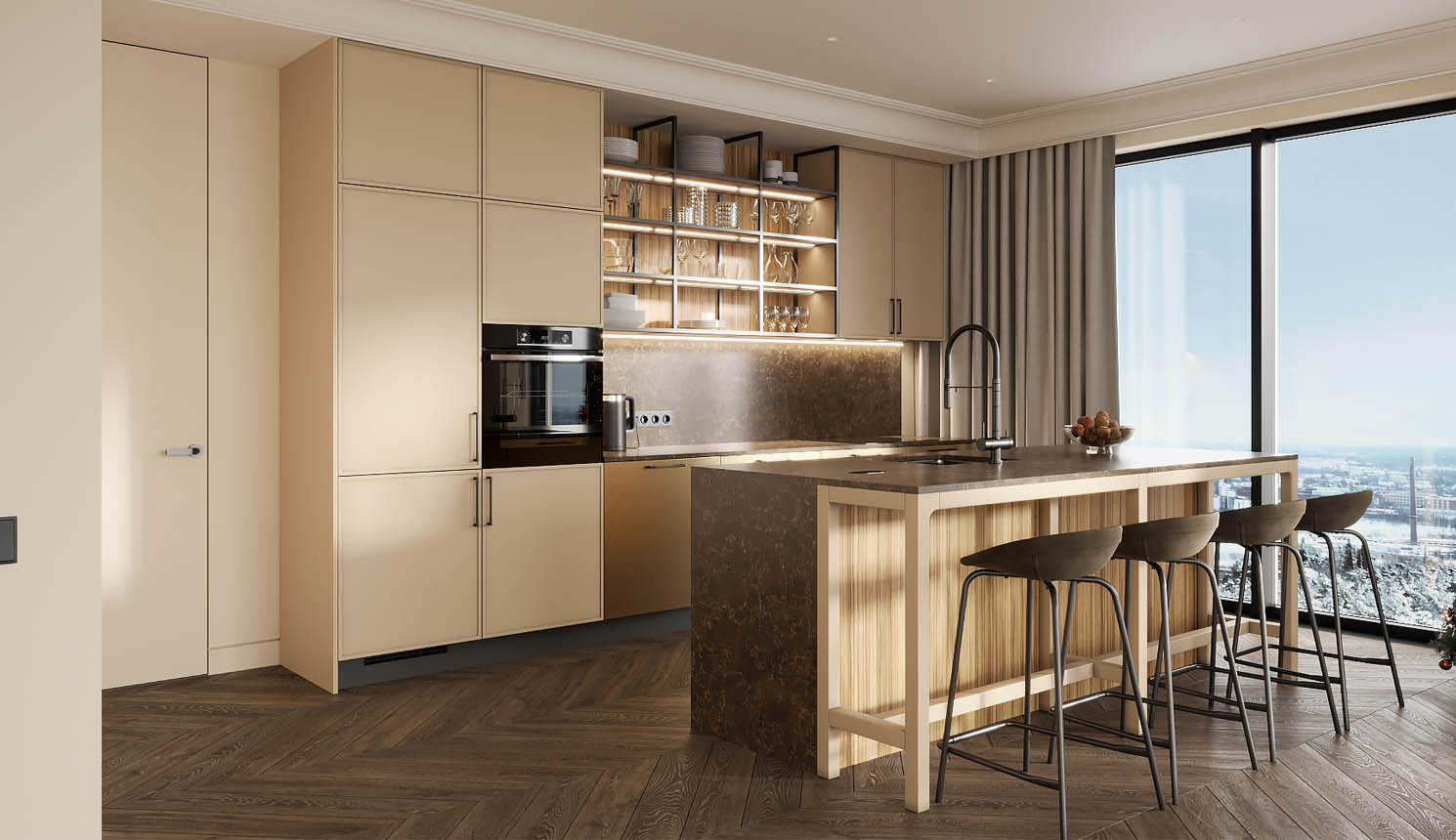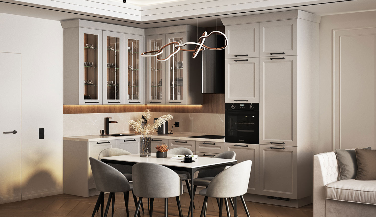 • Красивая кухня с золотыми акцентами в двухкомнатной квартире бизнес-класса
