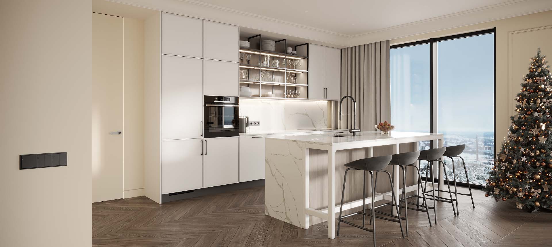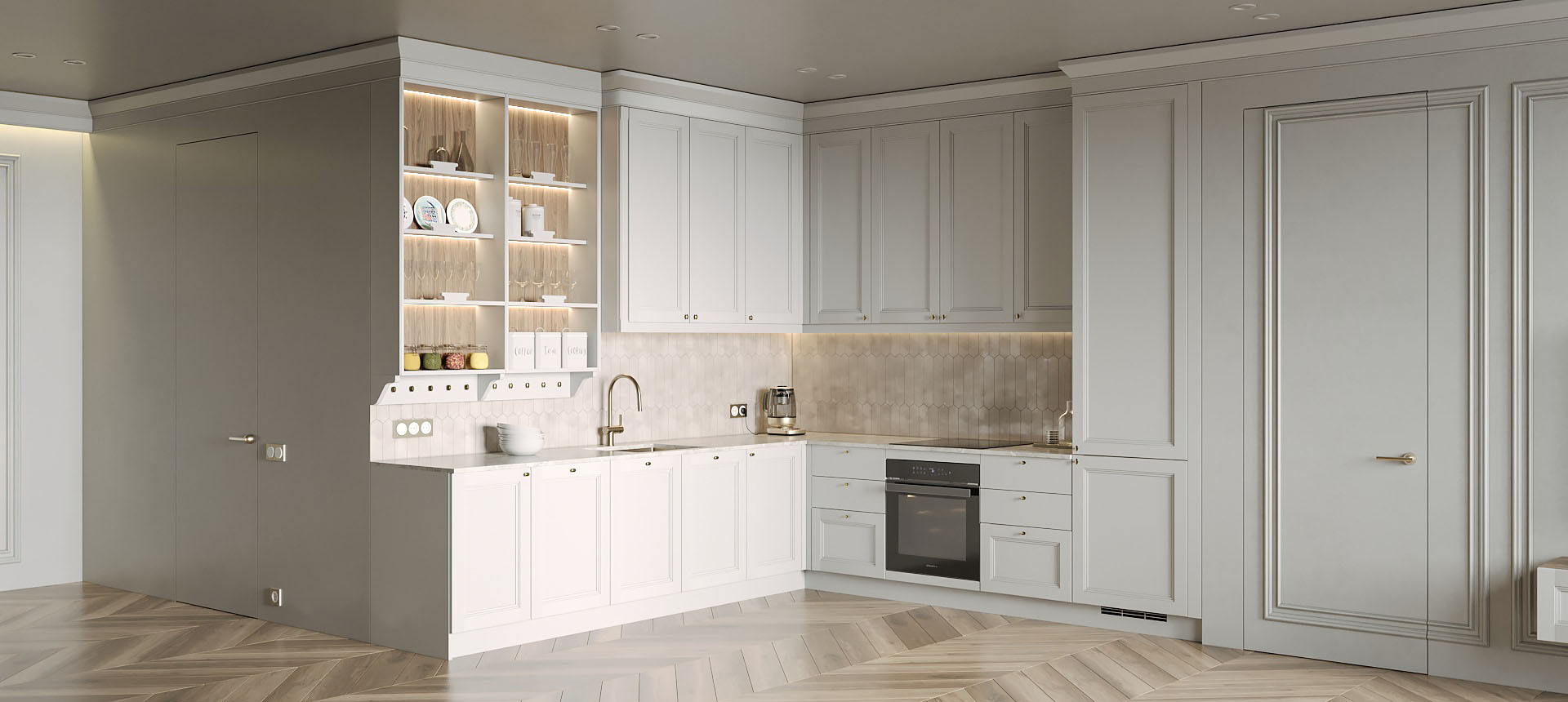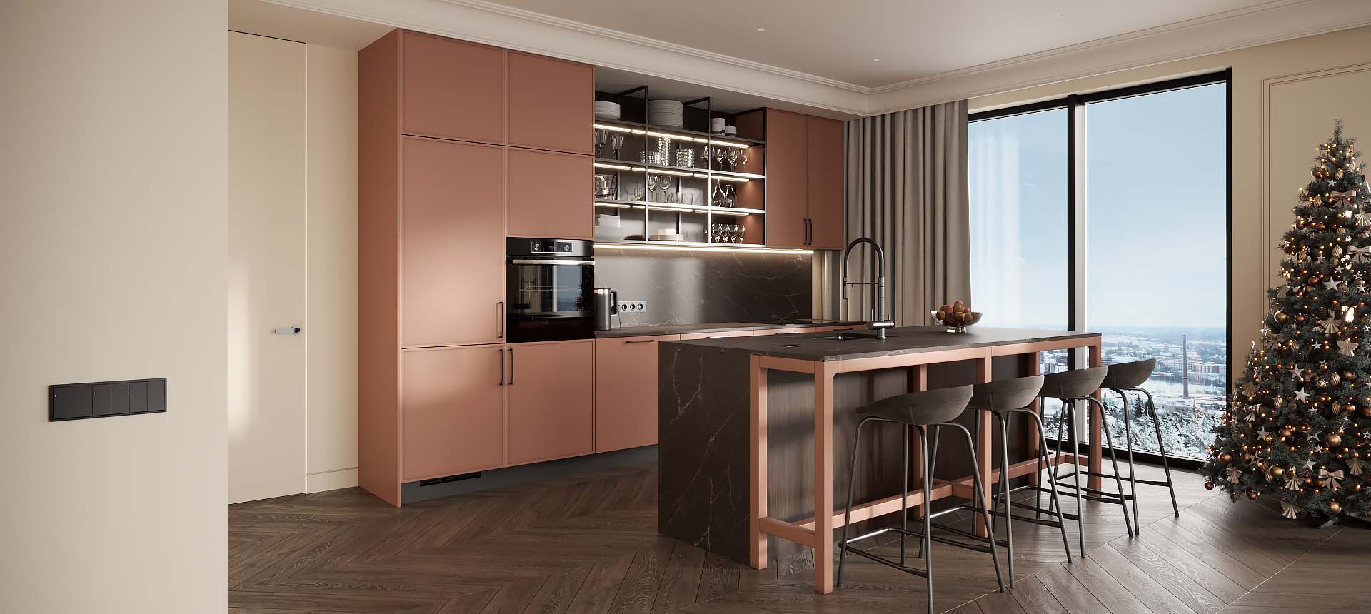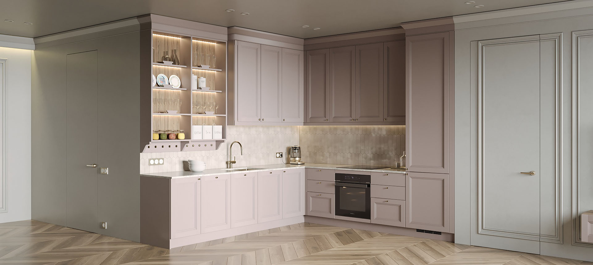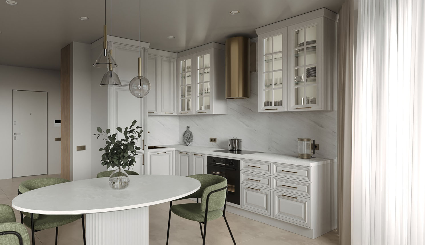 • Красивая кухня с золотыми акцентами в двухкомнатной квартире бизнес-класса