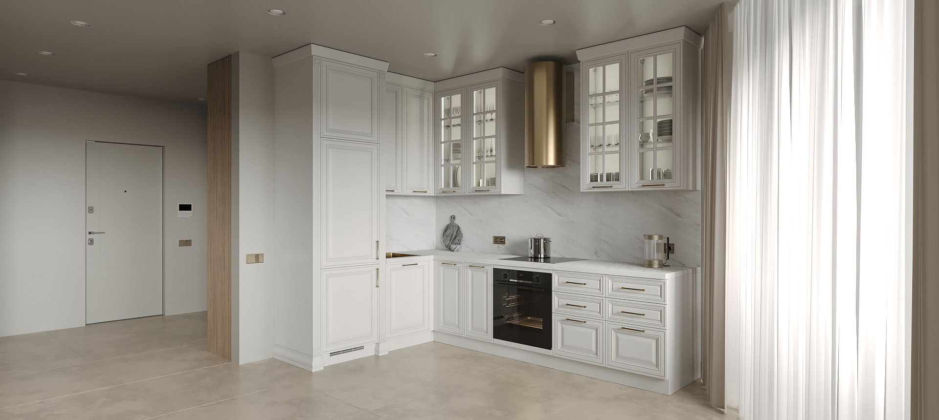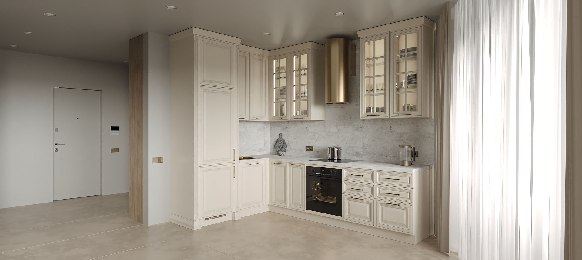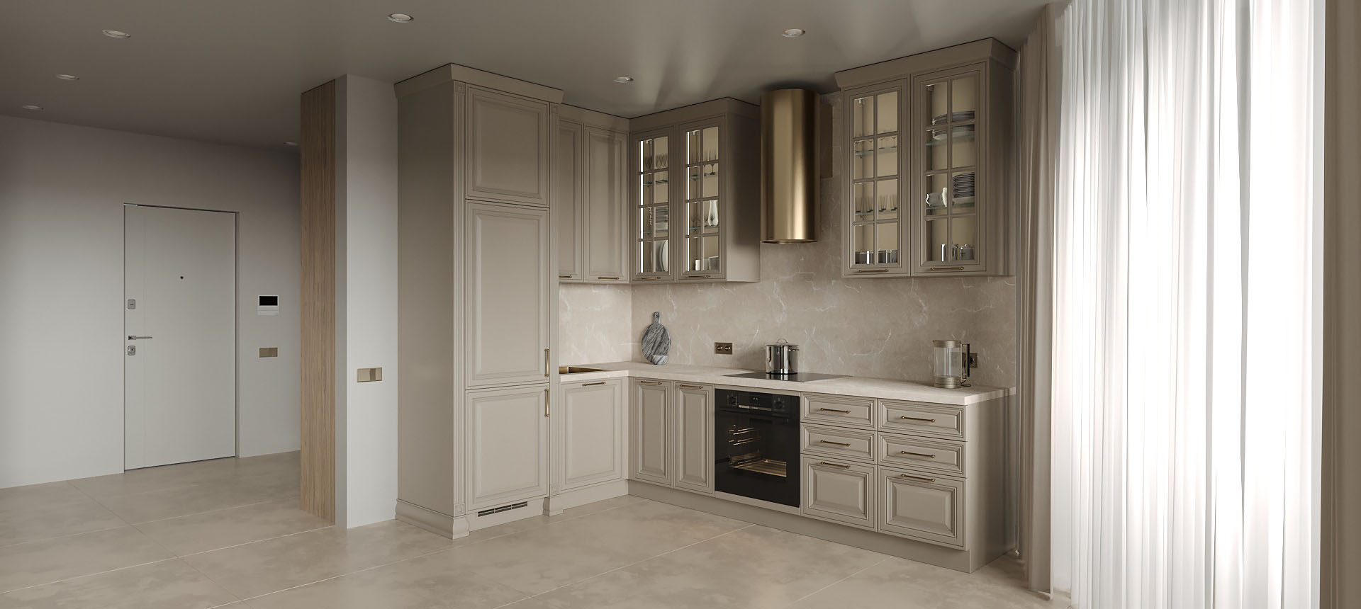 Светлая функциональная квартира в бежевых тонах для семьи из трех человек