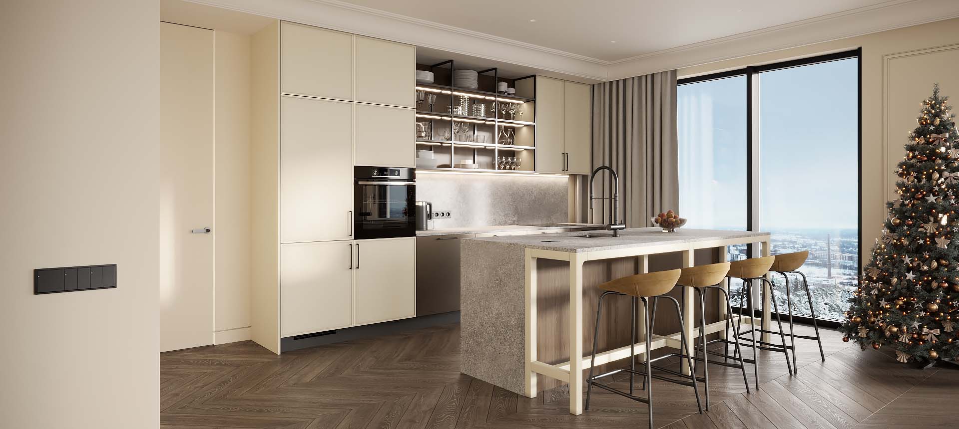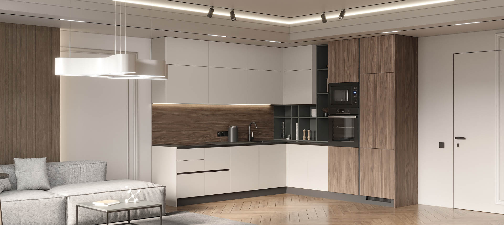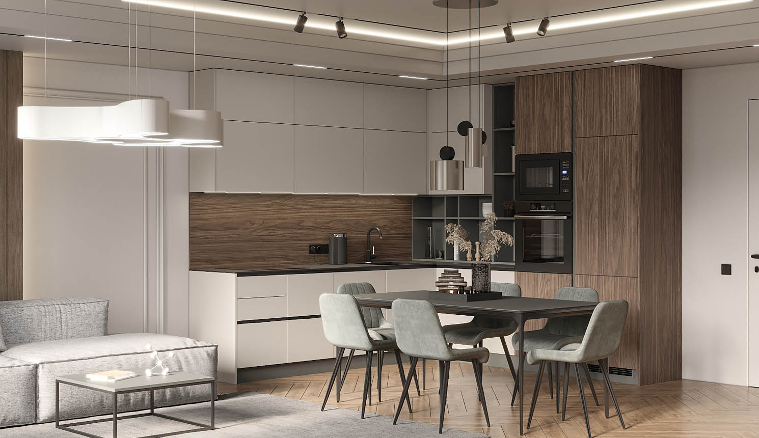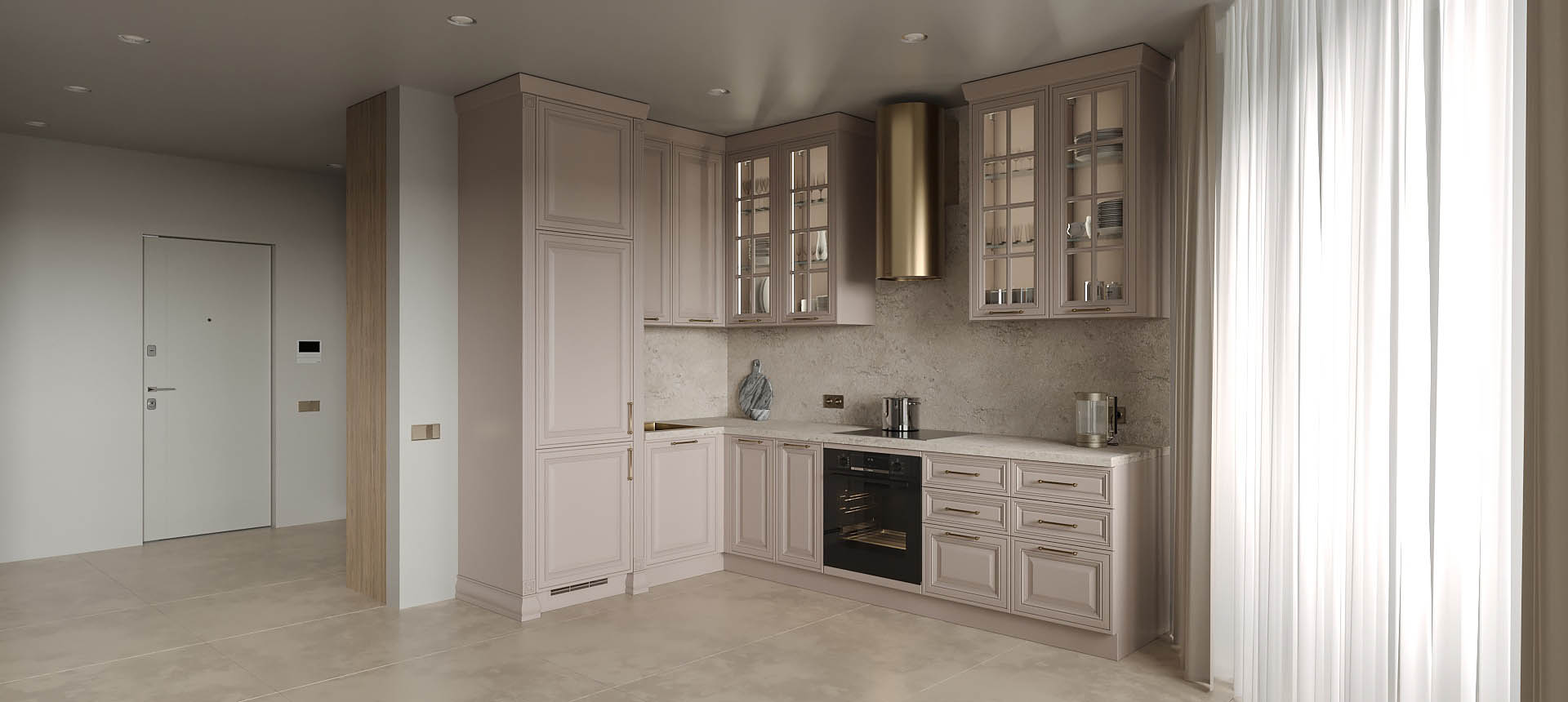 Светлая функциональная квартира в бежевых тонах для семьи из трех человек