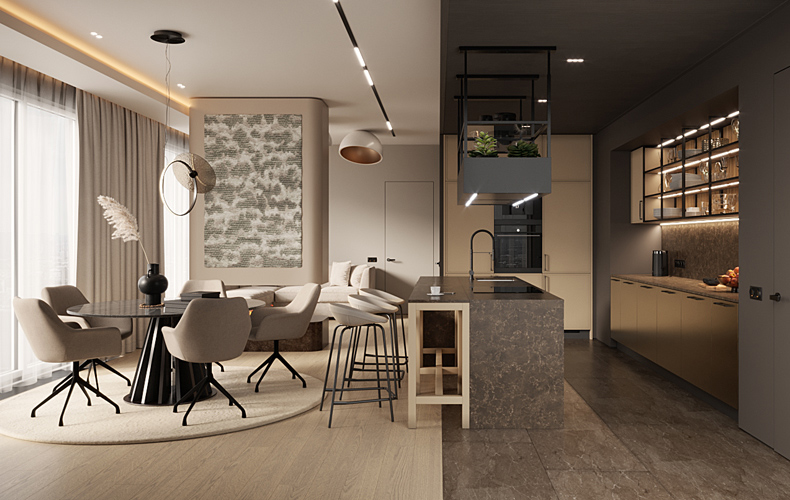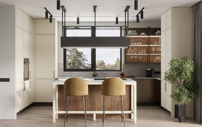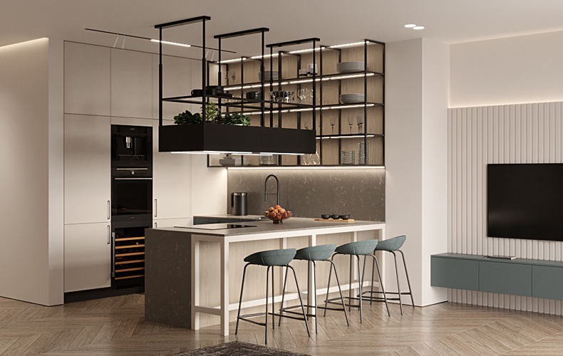 Кухонный гарнитур Ренцо 15 выполнен в сочетании фасадов «Ренцо» и «Маттео». Большой кухонный гарнитур содержит колонки под хранение и встраиваемую технику, напольные шкафы с ящиками, навесные шкафы с полками, секцию навесных открытых полок. В рабочей зоне установлена мойка со смесителем. На остров вынесена варочная поверхность с вытяжкой. Есть барная стойка как часть кухонного острова.