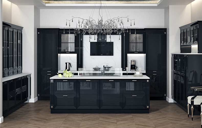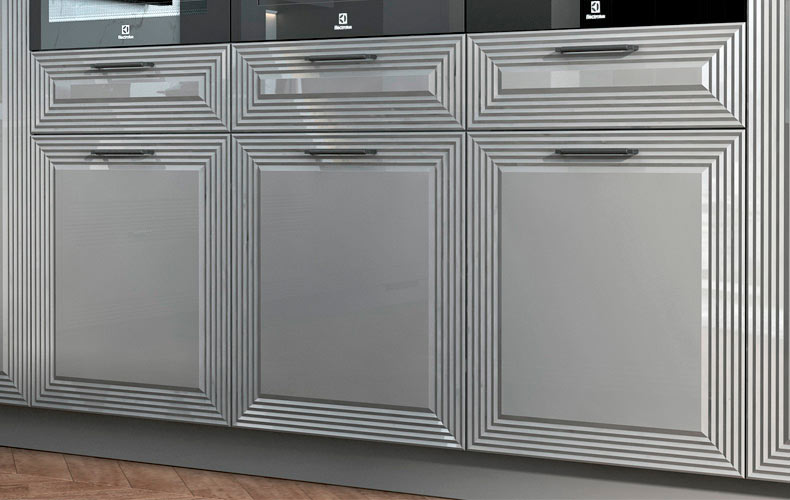 Кухонный гарнитур Серджио – образец по-настоящему роскошной мебели в классическом исполнении. Глянцевые фасады в серых оттенках создают уютную, спокойную атмосферу. Благодаря отражающим свет поверхностям кухня выглядит просторнее. В конструкции нет ничего лишнего, и при этом это практичный и функциональный гарнитур. Для хранения принадлежностей предусмотрены напольные системы и навесные шкафы с витражами, бытовая техника размещается в колонках. И даже вытяжка скрыта за декоративным фасадом. Рабочая зона выполнена в контрастном тёмном цвете и оснащена подсветкой.