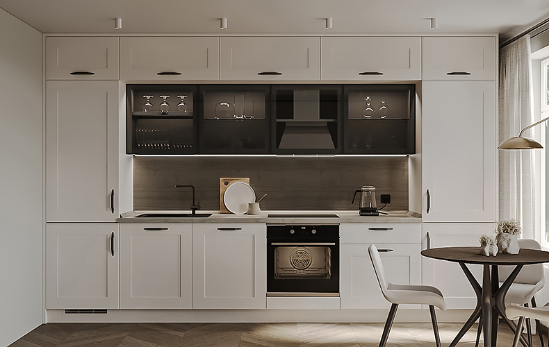 Кухонный гарнитур Томмази – это простые, но практичные конструктивные решения; он идеально подойдёт для объединённых пространств. По одной линии размещена рабочая зона с варкой, мойкой и системами хранения. Сверху расположены антресоли и навесные шкафы с тонированными стёклами. Под обеденную зону отведён отдельно вынесенный остров. Поверхности оформлены в зелёных тонах, в качестве контрастных элементов используются рамочные матовые фасады. Встроенная подсветка не только расставляет нужные акценты и создаёт на кухне уютную атмосферу, но и подчёркивает оригинальность дизайна.
