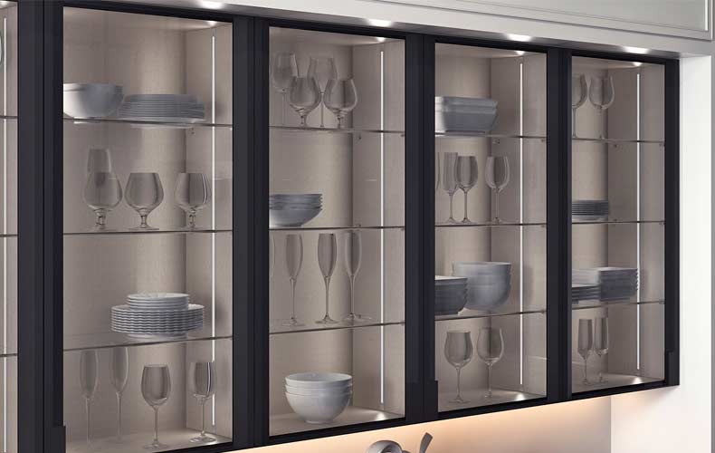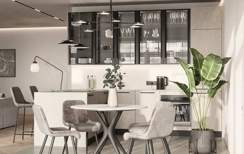Кухонный гарнитур Урбано – это совершенно новый взгляд на оформление интерьера. В дизайне кухни доминируют приёмы, характерные для современного урбанистического направления: ничего лишнего, максимум практичности и комфорта. В центре – островной элемент с рабочей зоной. Над островом расположена вытяжка, сбоку – барная стойка, заменяющая обеденную зону. Вдоль стены располагаются высокие навесные шкафы с фасадами из алюминиевой рамки Rail, вставками из стекла и подсветкой. В нижней части острова предусмотрены открытые полки со встроенными световыми элементами. Фасады из керамики отлично сочетаются с металлическими поверхностями.