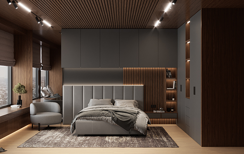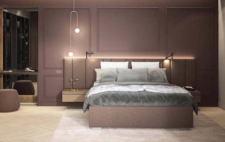 Мебель для спальни представлена шкафом на четыре створки, кроватью с мягкими панелями в изголовье, прикроватными тумбами и консольной секцией с зеркалом и пуфом. Вся мебель выполнена в бежевых мягких тонах. Шкаф имеет классические двери из серии «Лилия» и оснащен полками, ящиками и штангами для хранения белья и одежды. консольная секция с зеркалом и пуфом «Трюфель» расположены напротив шкафа. Есть локальная подсветка отдельных зон, а также можно заказать и декоративные подушки в цветах, используемых в мебели для спальни и интерьере комнаты.