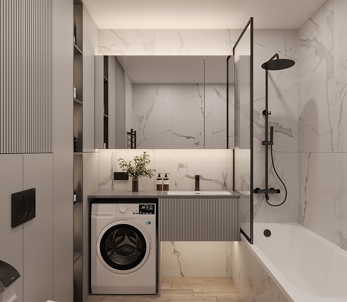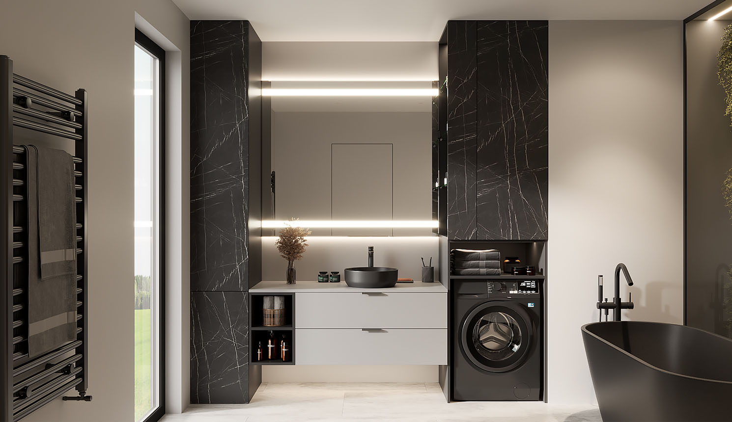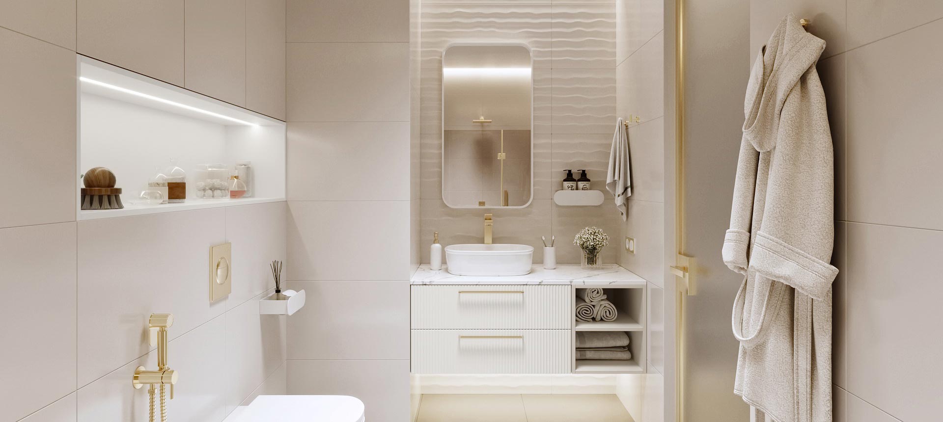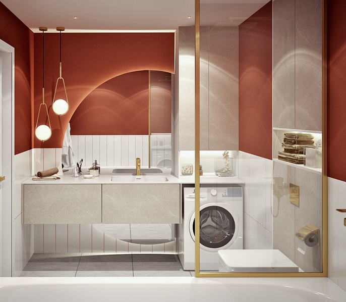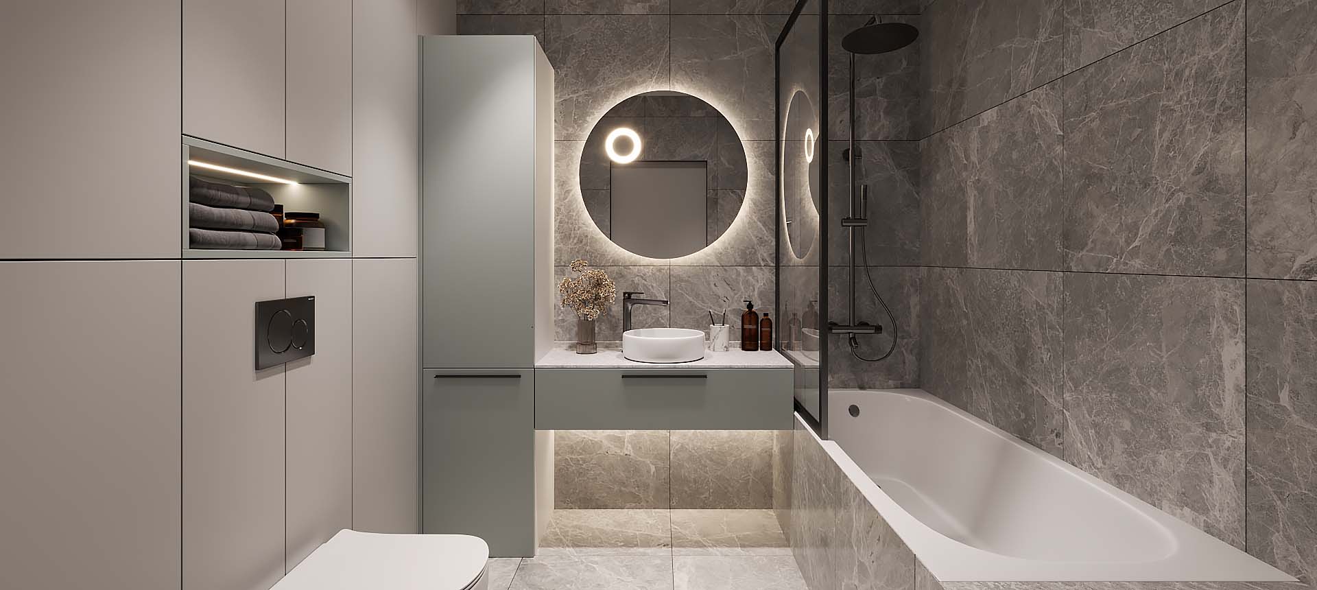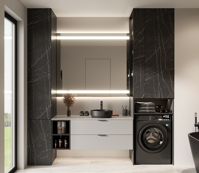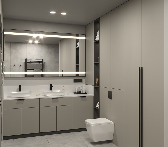 «У меня все проекты с компанией («Стильные Кухни и Интерьеры) были хорошие, но мебелью в ванную комнату я довольна больше всего на свете. Мне сделали тумбу под раковину, две навесные колонки по бокам, зеркало с подсветкой, а также встроенный шкаф напротив. Из-за высоты потолков и размеров шкафов было непросто спроектировать все так, как надо: были опасения, что дверцы ослабнут, что тяжелые дверцы нельзя будет открывать одним легким нажатием. Но в итоге в фасады добавили направляющие, которые их усиливают. И еще удалось сделать эти высокие двери с механизмом push-to-open. У меня не очень большая площадь ванной, поэтому хотелось обойтись без лишних деталей, в том числе и выступающих ручек, которые я бы постоянно задевала»,