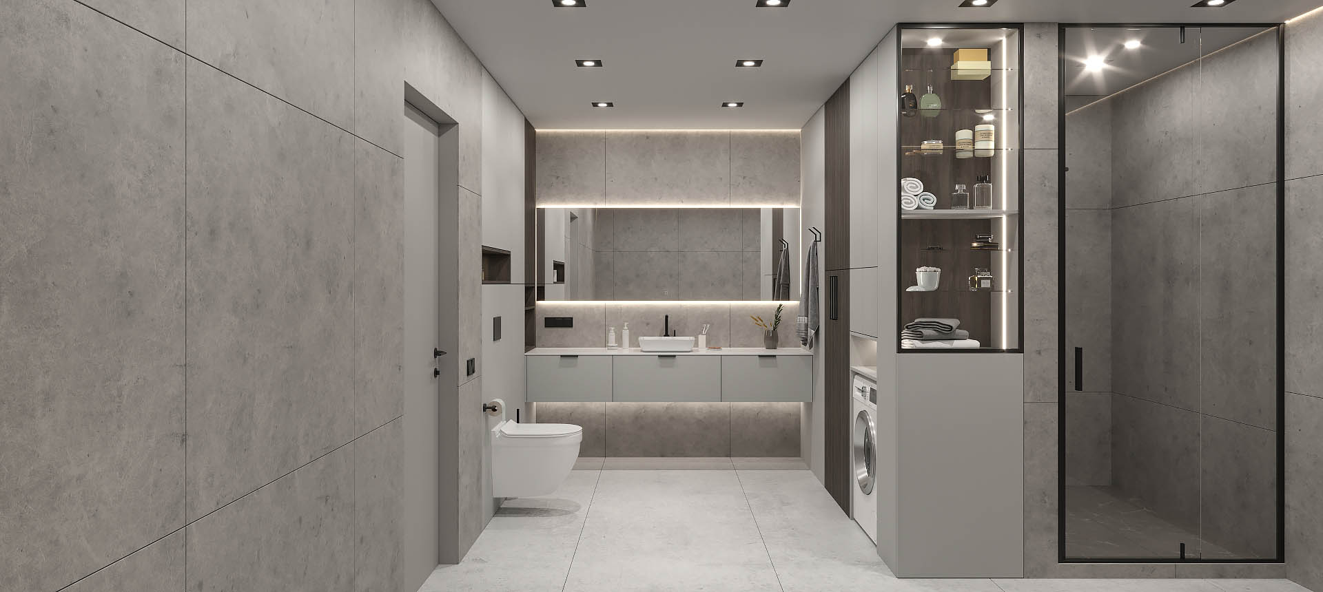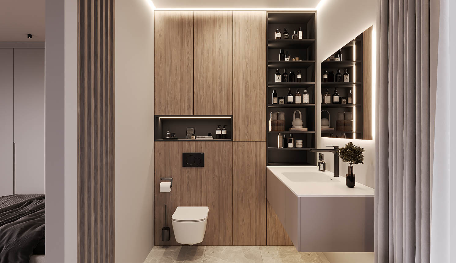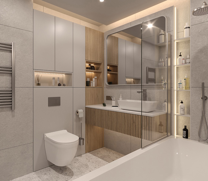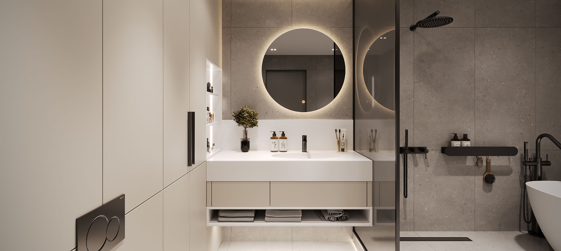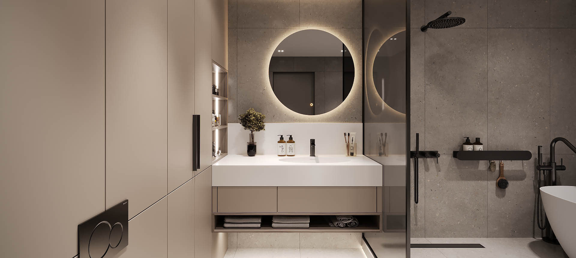 «У меня все проекты с компанией («Стильные Кухни и Интерьеры) были хорошие, но мебелью в ванную комнату я довольна больше всего на свете. Мне сделали тумбу под раковину, две навесные колонки по бокам, зеркало с подсветкой, а также встроенный шкаф напротив. Из-за высоты потолков и размеров шкафов было непросто спроектировать все так, как надо: были опасения, что дверцы ослабнут, что тяжелые дверцы нельзя будет открывать одним легким нажатием. Но в итоге в фасады добавили направляющие, которые их усиливают. И еще удалось сделать эти высокие двери с механизмом push-to-open. У меня не очень большая площадь ванной, поэтому хотелось обойтись без лишних деталей, в том числе и выступающих ручек, которые я бы постоянно задевала»,