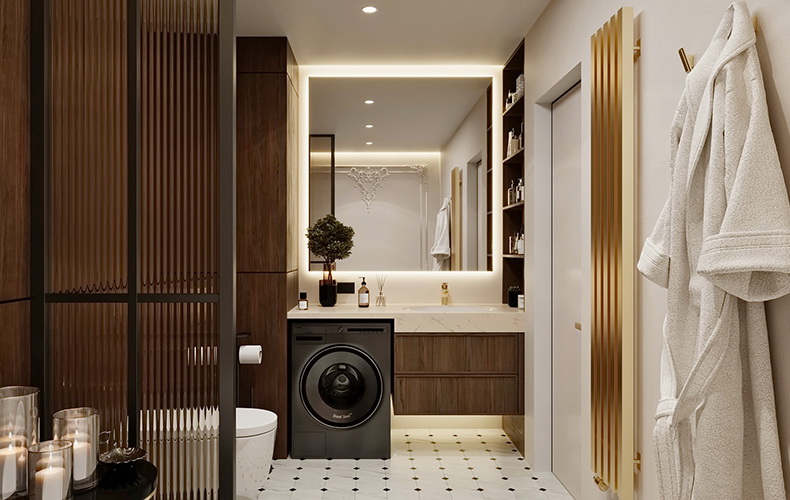 Везде используется локальная подсветка. Парящая подсвеченная конструкция придает воздушности интерьеру небольшого помещения и облегчает поддержание чистоты.