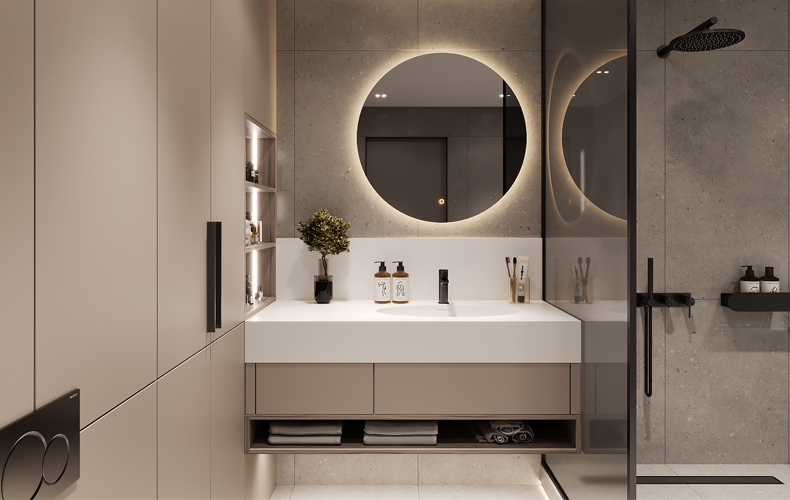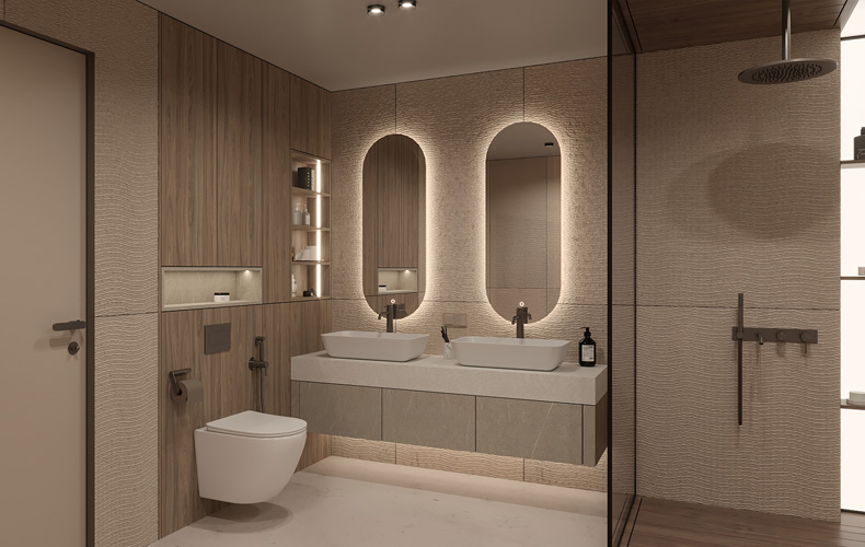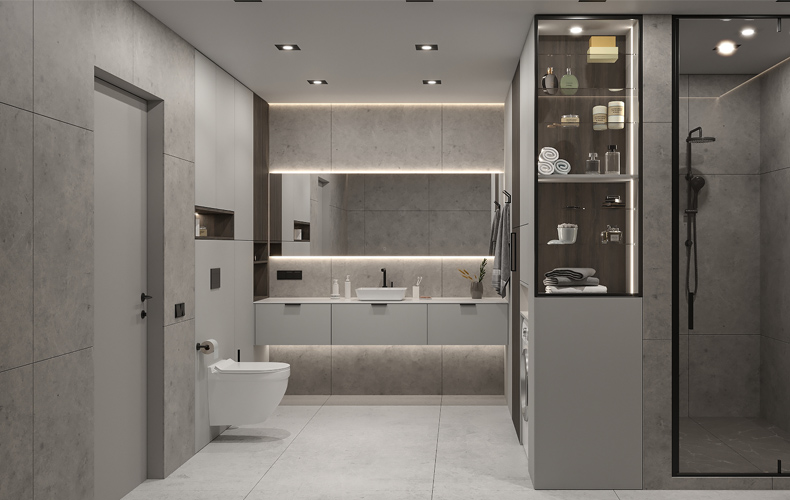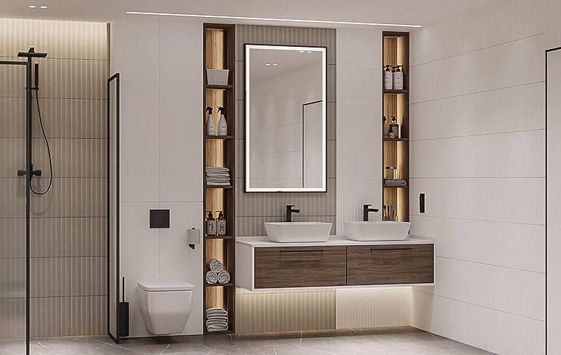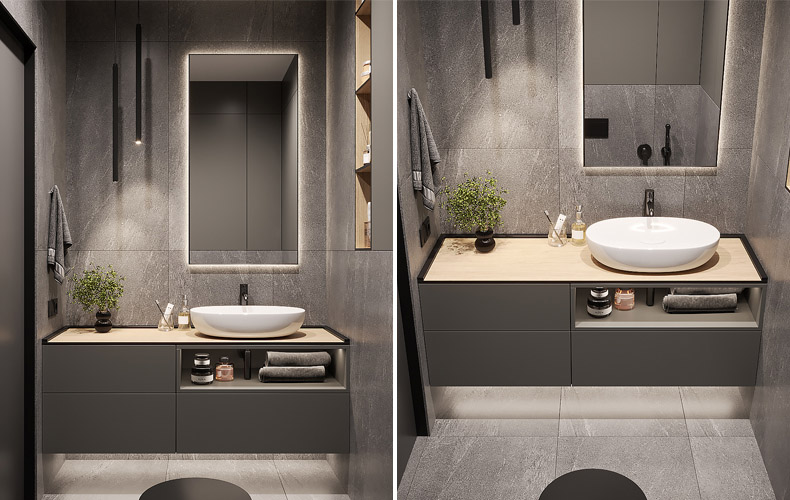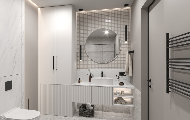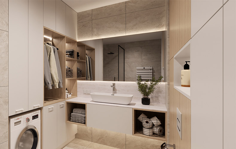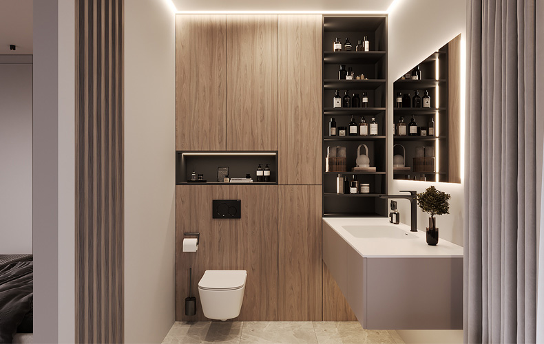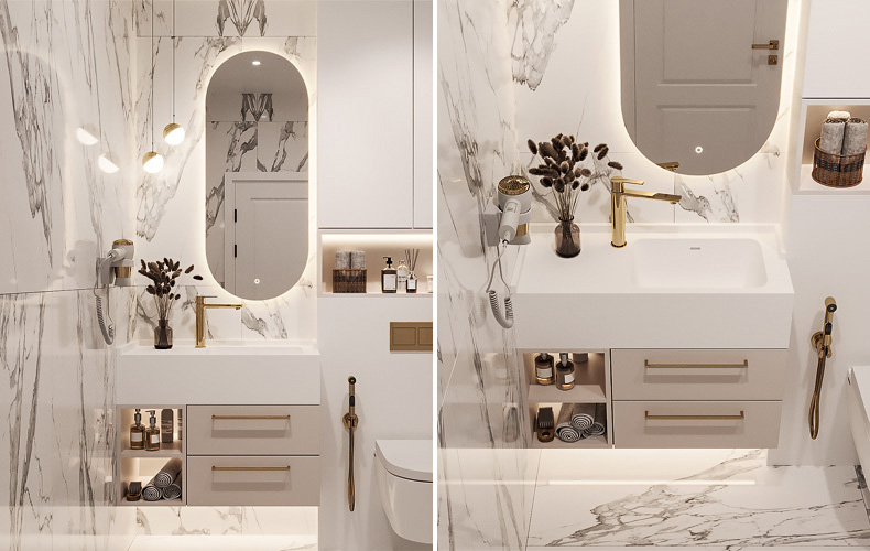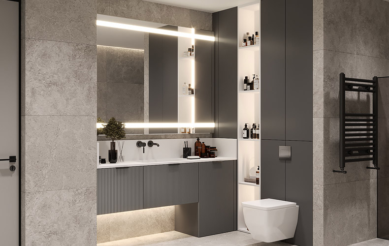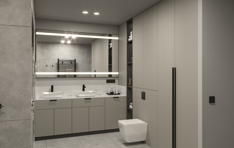 Мебель для ванной 39 представлена тумбой с раковиной, зеркалом с подсветкой, встроенной секцией с открытыми полками и встроенными шкафами вдоль стены. Широкая столешница на тумбе с интегрированной мойкой позволяет удобно размещать предметы повседневного использования.