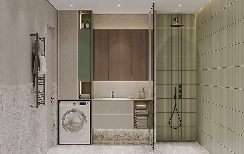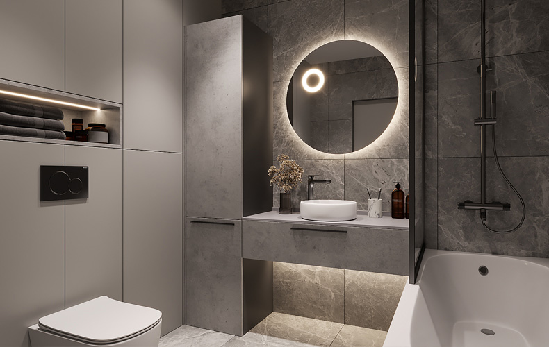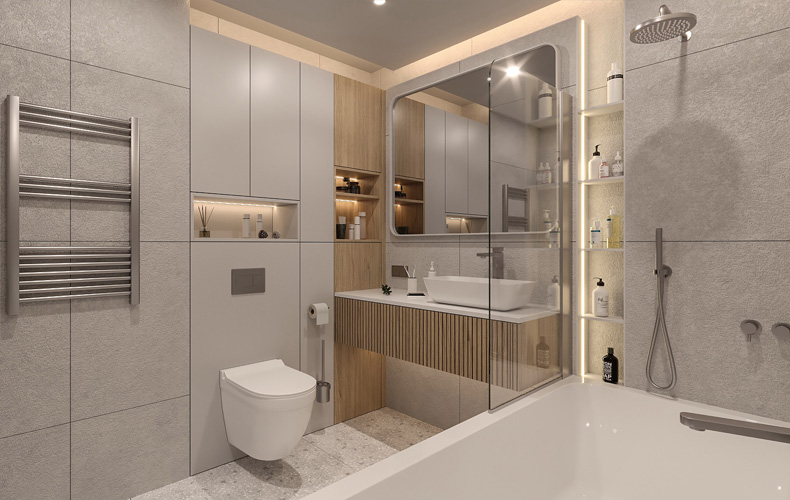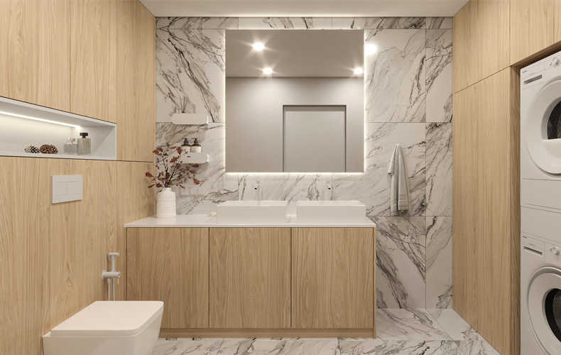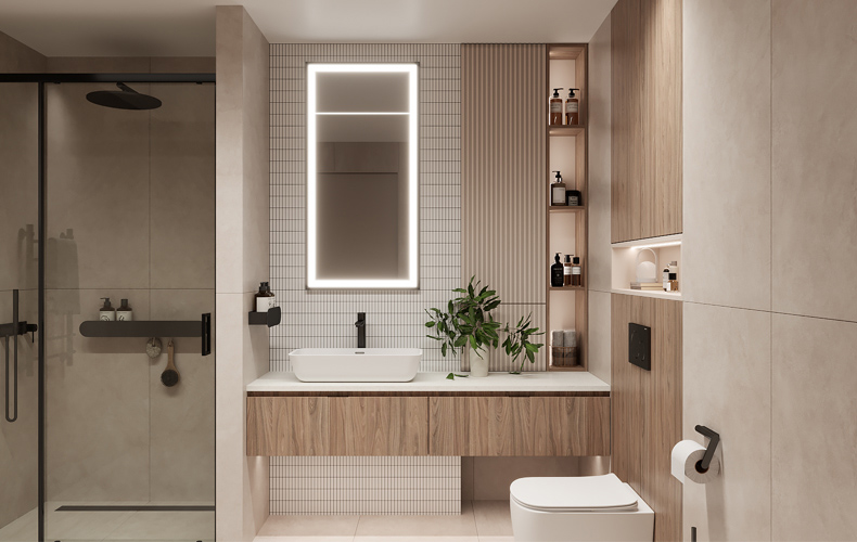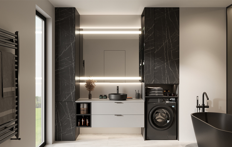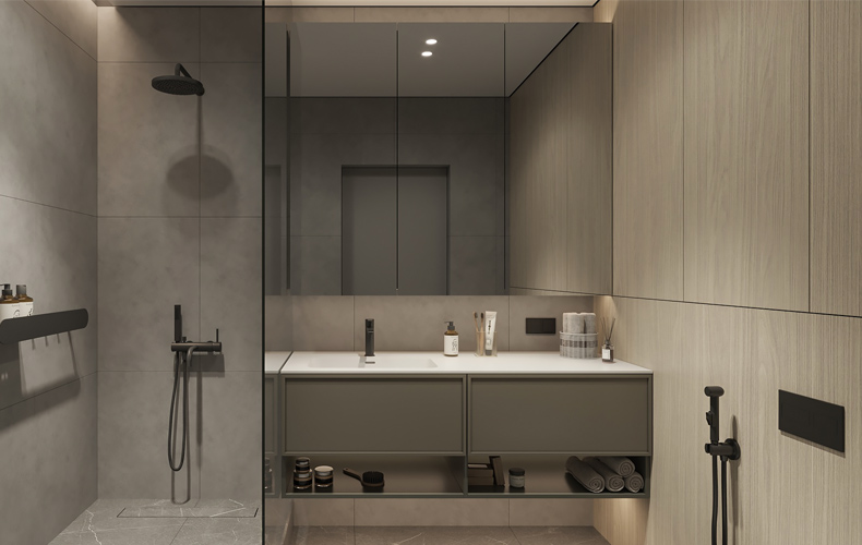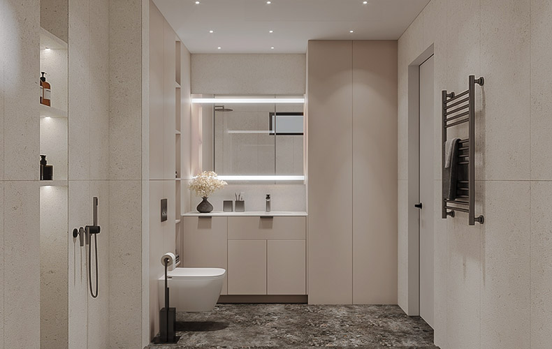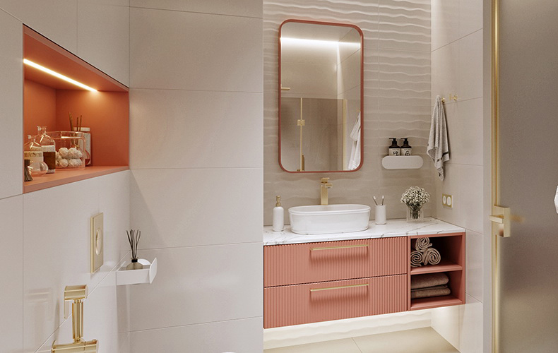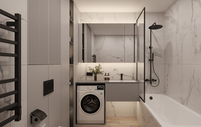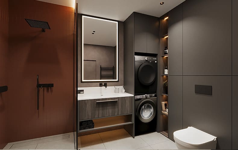 Мебель для ванной 39 представлена тумбой с раковиной, зеркалом с подсветкой, встроенной секцией с открытыми полками и встроенными шкафами вдоль стены. Широкая столешница на тумбе с интегрированной мойкой позволяет удобно размещать предметы повседневного использования.