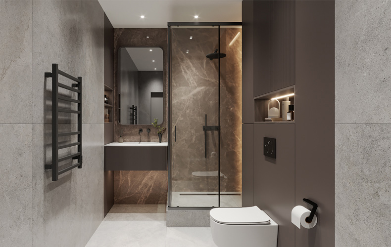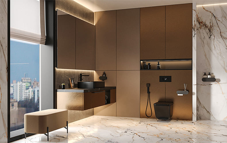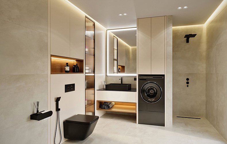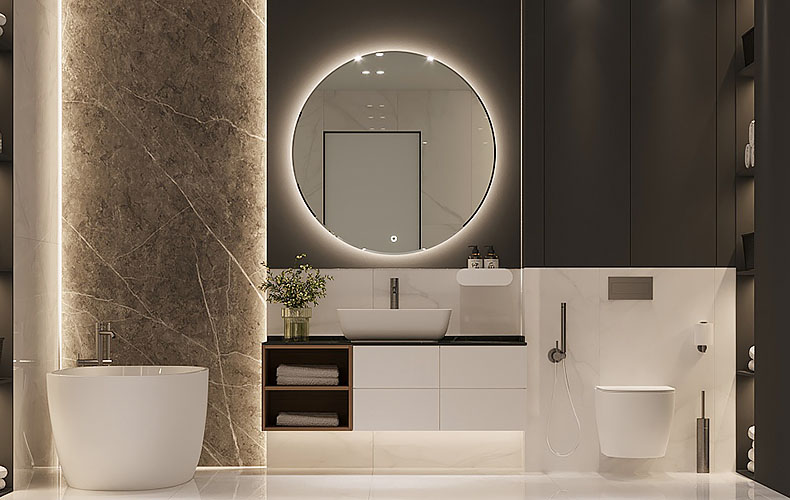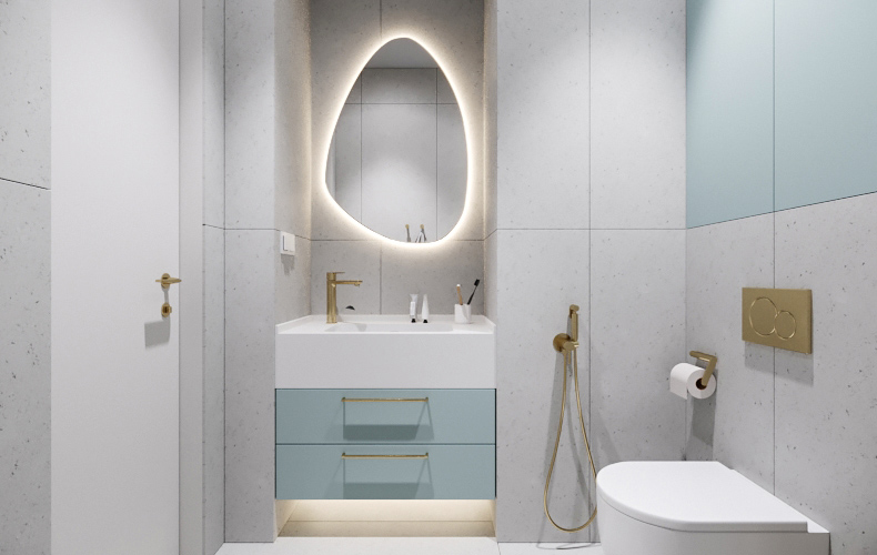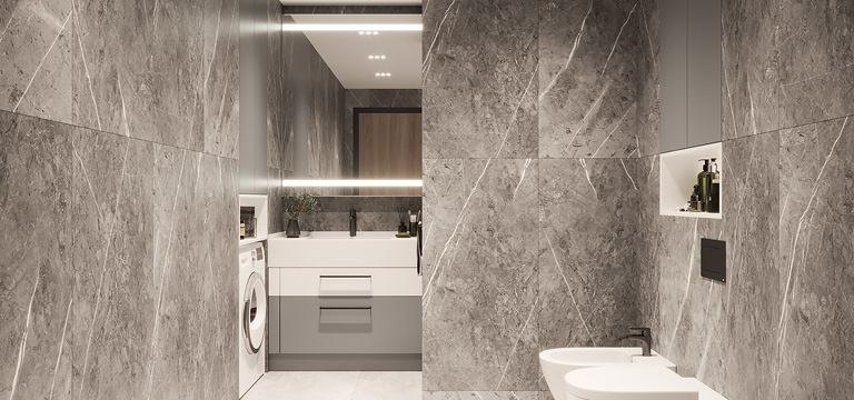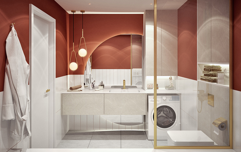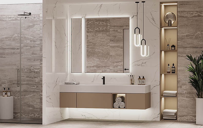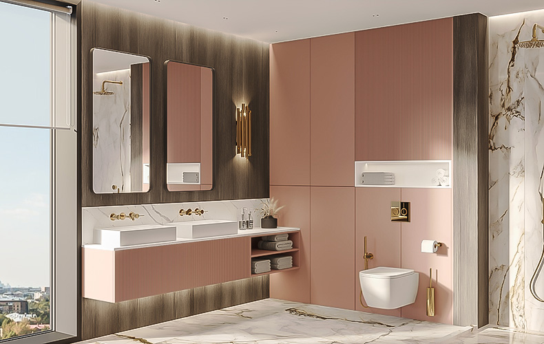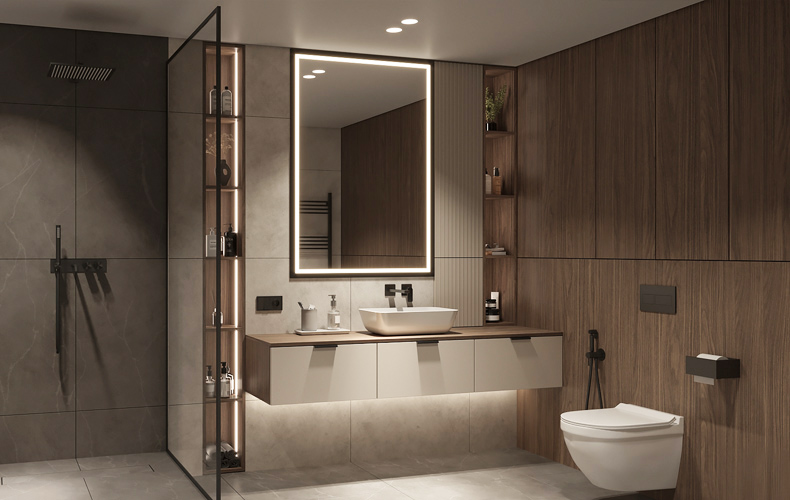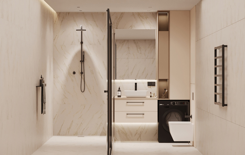 Мебель для ванной 39 представлена тумбой с раковиной, зеркалом с подсветкой, встроенной секцией с открытыми полками и встроенными шкафами вдоль стены. Широкая столешница на тумбе с интегрированной мойкой позволяет удобно размещать предметы повседневного использования.