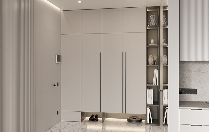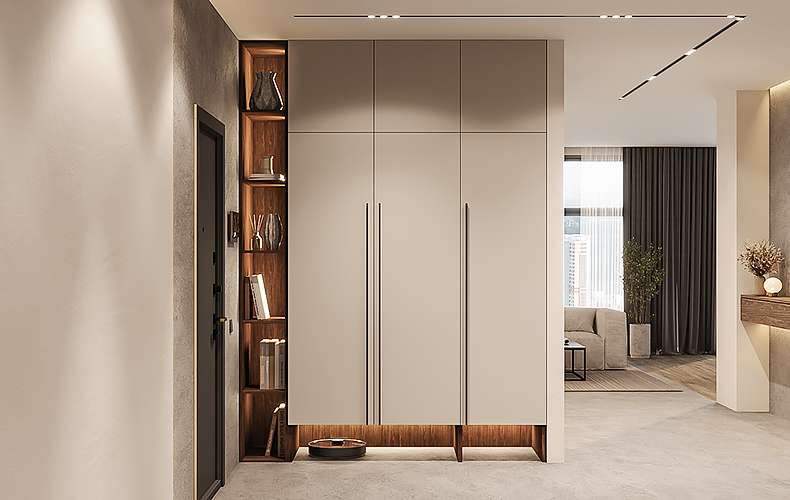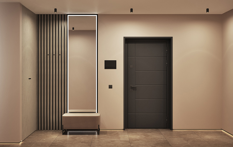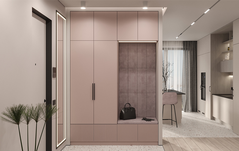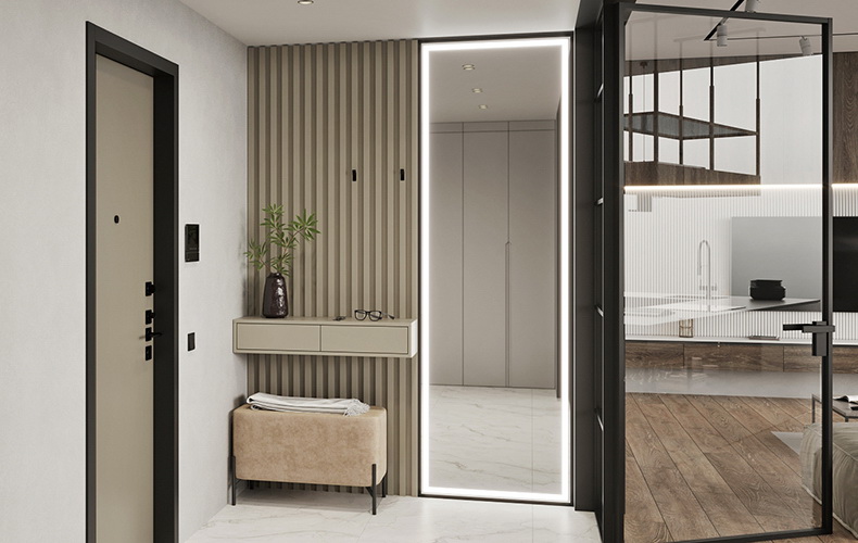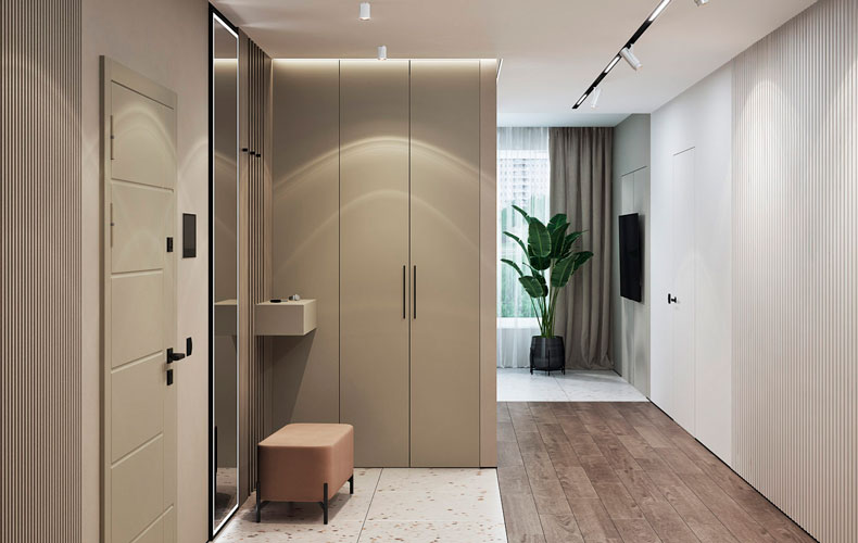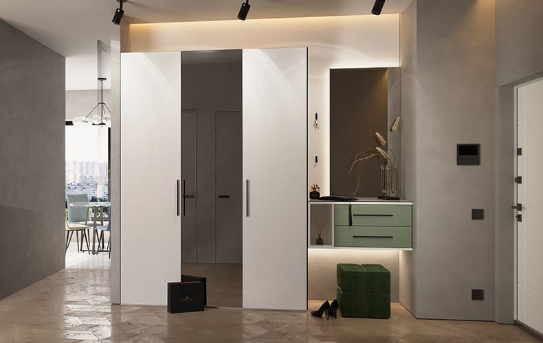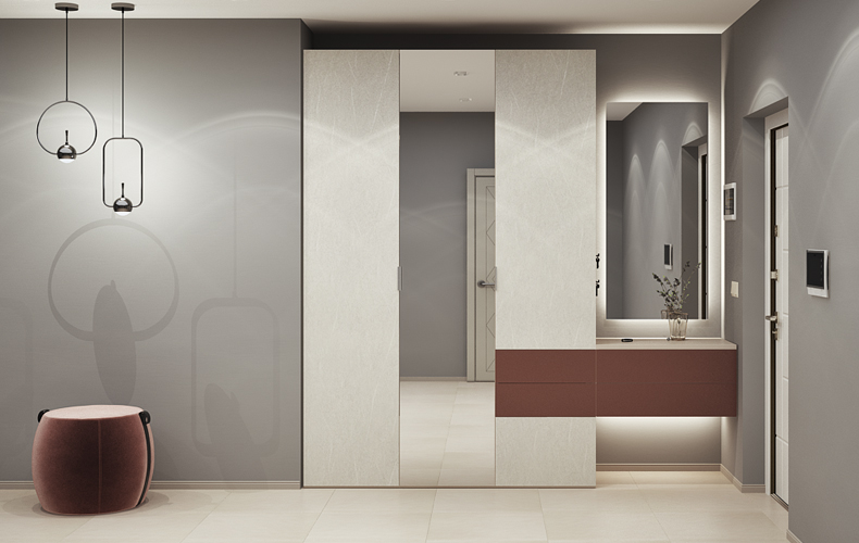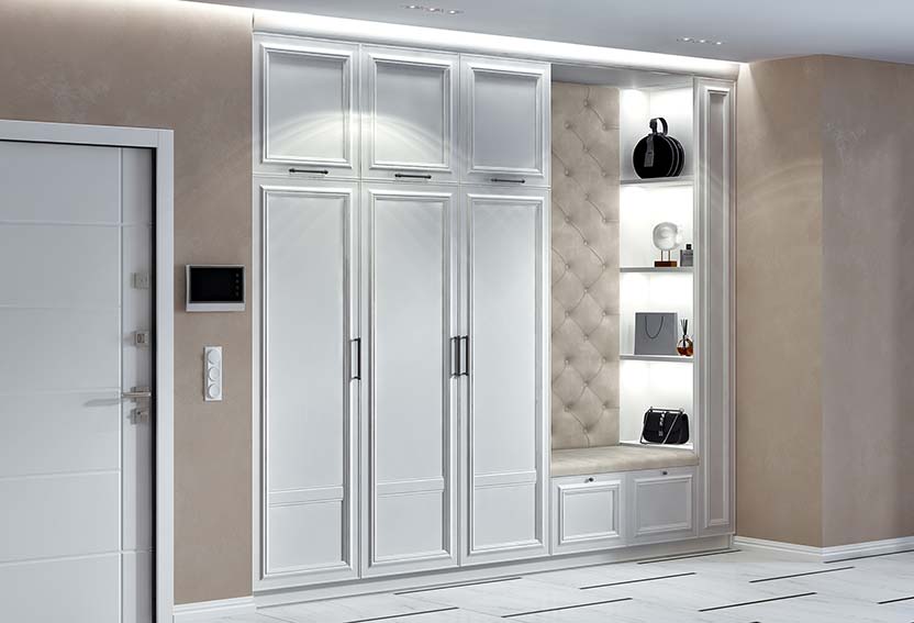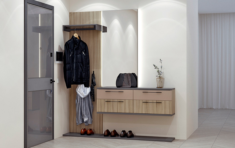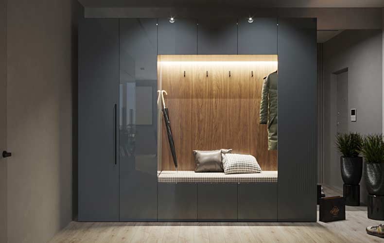 Хорошим вариантом в прихожей является применение мягких панелей и седушек, добавленных в конструкцию мебели, со всевозможными крючками, петлями и держателями. Отдельно, для прихожей можно использовать локальную подсветку зеркал или высоких шкафов.