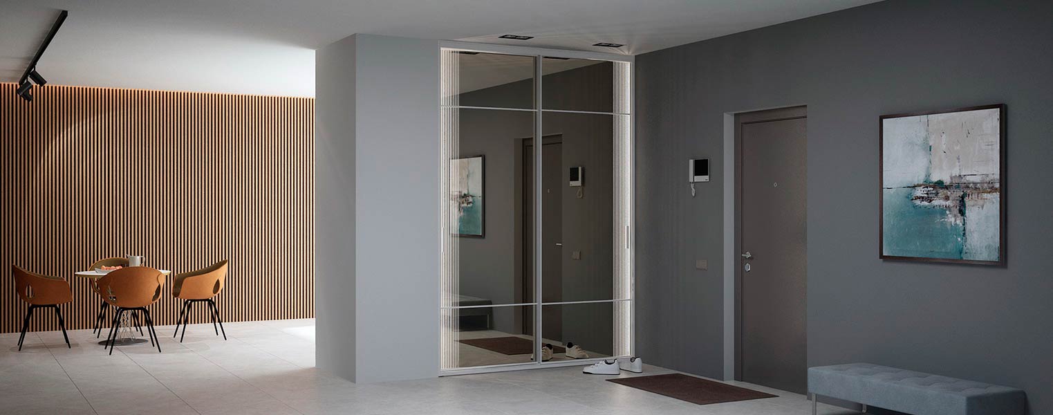 Вместительная и практичная конструкция шкафа-купе идеально подходит для прихожей. Внутри предусмотрены полки для хранения головных уборов, обуви, аксессуаров, а также штанга для верхней одежды. Двери выполнены из стекла, шкаф имеет дополнительную подсветку.