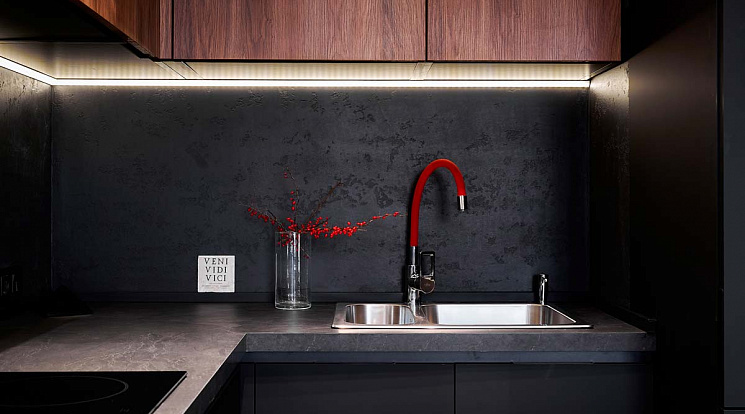 • Красивая кухня с золотыми акцентами в двухкомнатной квартире бизнес-класса