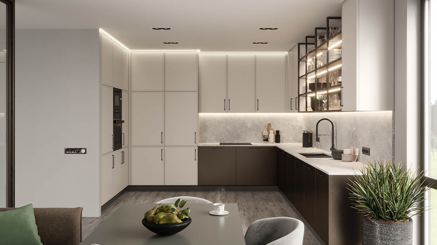 Кухонный гарнитур Ренцо 6 имеет п-образную конфигурацию с колонками и элементами из металла. По левую сторону расположены встроенные шкафы-колонки под бытовую технику, холодильник и хранение. В центральной части кухни и в правой секции располагается рабочая зона со столешницей из агломерата. Эффектно смотрятся открытые полки из алюминиевого профиля с подсветкой. Нижние шкафы представлены фасадами «Маттео Лайт», бежевые фасады «Ренцо» в эмали.