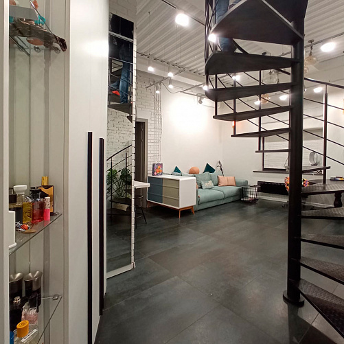 Пространство квартиры-лофта интересно тем, что при небольшой площади комнат они очень высокие. В связи с этим шкафы сделаны так, что верхняя часть их приспособлена для вещей долгосрочного хранения. Чтобы высокие шкафы не казались массивными, использованы на одном и том же изделии панели разного цвета и фактуры. Для расширения пространства зоны прихожей, шкаф сделан с поворотом и зеркальными панелями, чтобы пространство зрительно казалось больше.