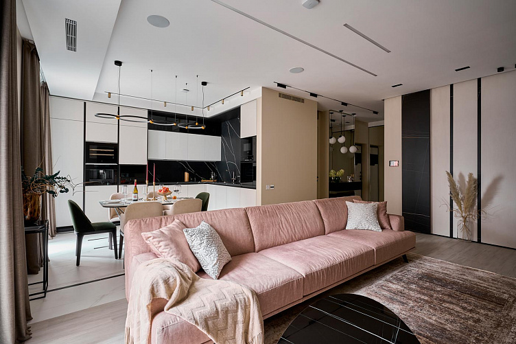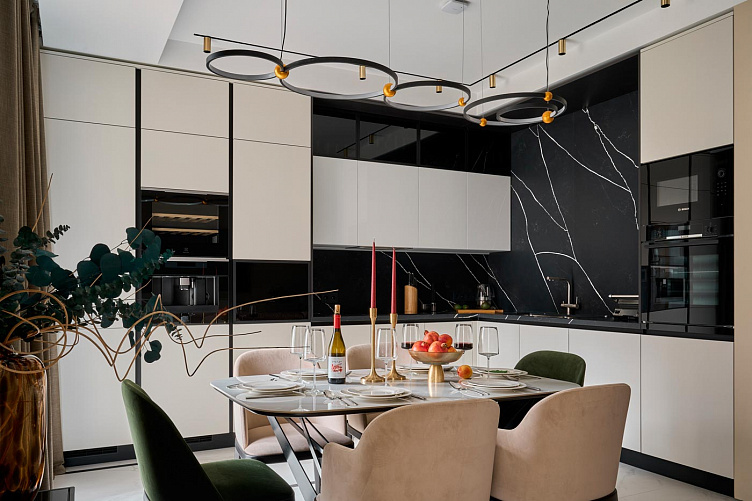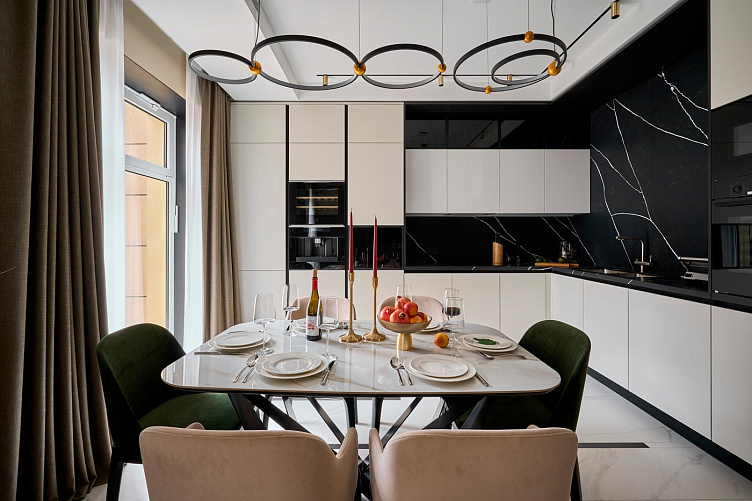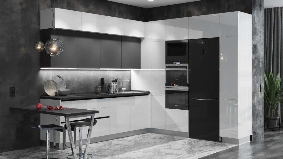 Кухонный гарнитур Лучидо идеально дополнит интерьер в современной стилистике. Угловая конструкция будет одинаково уместной и в маленьких помещениях, и в просторных кухнях, совмещённых с гостиной. Для оформления фасадов используются глянцевые белые и матовые чёрные плиты. Благодаря встроенной подсветке, отражающим свет поверхностям и сочетанию контрастных цветов создаётся эффект глубины. Гарнитур оснащён различными системами хранения, навесными и напольными шкафами, бытовой техникой. Также предусмотрен холодильник и кухонный телевизор. В качестве завершающей детали – обеденный стол на одной опоре.