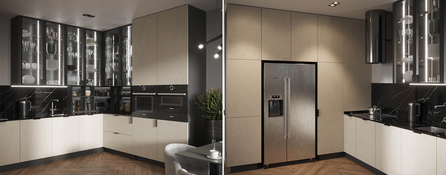 • Красивая кухня с золотыми акцентами в двухкомнатной квартире бизнес-класса