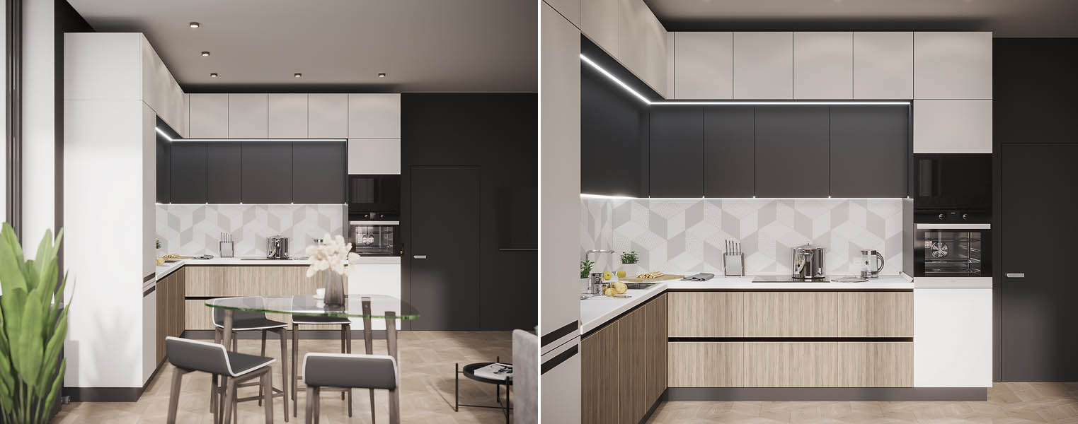• Красивая кухня с золотыми акцентами в двухкомнатной квартире бизнес-класса