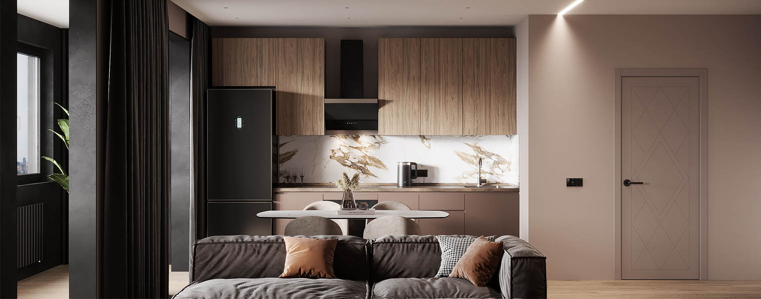 • Красивая кухня с золотыми акцентами в двухкомнатной квартире бизнес-класса